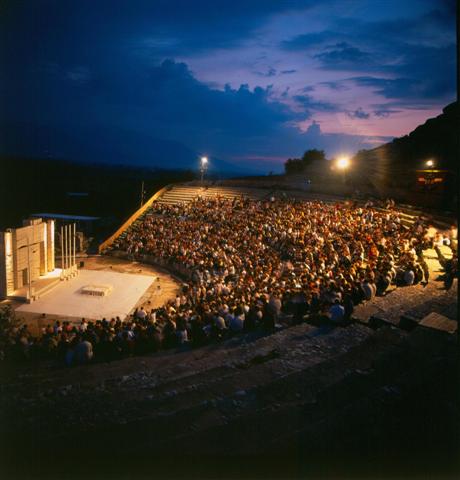 Η αρχική φάση του, που είναι σύγχρονη με τα τείχη της πόλης, ανάγεται στα χρόνια του βασιλιά της Μακεδονίας Φιλίππου Β’ (μέσα του 4ου αιώνα π.Χ.) και οι διαστάσεις του αποδεικνύουν ότι πρόκειται για ένα από τα μεγαλύτερα θέατρα της αρχαιότητας. Από τη φάση αυτή σώζονται οι αναλημματικοί τοίχοι (κατακόρυφοι τοίχοι που στήριζαν το κοίλο του θεάτρου) του κοίλου, δηλαδή του χώρου όπου κάθονται οι θεατές, και των παρόδων, των διαδρόμων που οδηγούσαν προς την ορχήστρα του θεάτρου. Την εποχή αυτή η ορχήστρα, ο υπαίθριος κεντρικός χώρος όπου «παίζουν» οι ηθοποιοί, είχε σχήμα πετάλου. Το θέατρο αυτό, εξακολούθησε να χρησιμοποιείται κι από τους Ρωμαίους αποίκους, αφού διασκευάστηκε για να προσαρμοστεί στα νέα θεάματα της ρωμαϊκής κοινωνίας και για να δεχθεί πολυάριθμους θεατές. Τον 2ο αιώνα μ.Χ., το θέατρο αποκτά τυπική ρωμαϊκή μορφή, με μεγαλοπρεπές τριώροφο κτίριο σκηνής, ορχήστρα στρωμένη με μαρμάρινες πλάκες και κοίλο που επεκτείνεται πάνω από τις παρόδους, που καλύπτονται με θολωτές κατασκευές. Μια εικόνα της μορφής αυτής του θεάτρου μας δίνει η νότια στοά του κτιρίου της σκηνής, που αναστηλώθηκε πρόσφατα και φέρει στα μέτωπα των πεσσών ανάγλυφες πλάκες με παραστάσεις που σχετίζονται με το θεό Διόνυσο (μαινάδες κ.ά.).