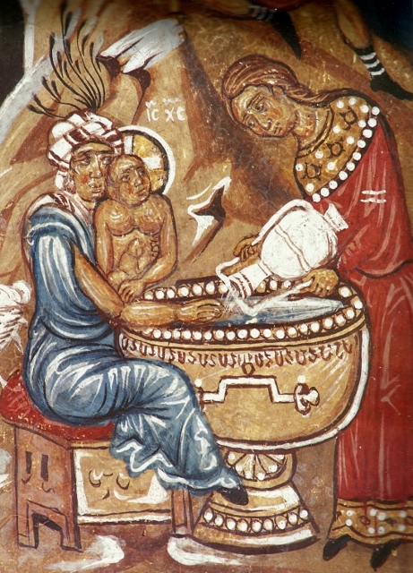 Η Μαία με υφαντό περίτεχνο καφαλόδεσμο κάθεται σε ξυλόγλυπτο «σκαμνίον» και κόκκινο μαξιλάρι. Η κολυμβήθρα φαίνεται να είναι χάλκινη με ψηλό πόδι και σφυρήλατο διάκοσμο.