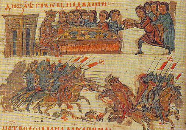 | Μικρογραφία του συμποσίου που παρέθεσε ο πατριάρχης Νικόλαος Μυστικός προς τιμή του Βούλγαρου ηγεμόνα Συμεών, με την παρουσία του αυτοκράτορα Κωνσταντίνου Ζ’ και της αυτοκράτειρας Ζωής |