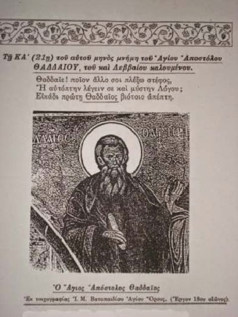 Θεού τού εν σώματι επιφανέντος ημίν, αυτόπτης γενόμενος, και ιερός μαθητής, Θαδδαίε Απόστολε, έλαμψας τοις εν σκότει, την σωτήριον χάριν, ώφθης των εν Εδέσση, ιατήρ λαμπαδούχος· διο τους προσιόντας Σοι, σκέπε εκάστοτε.