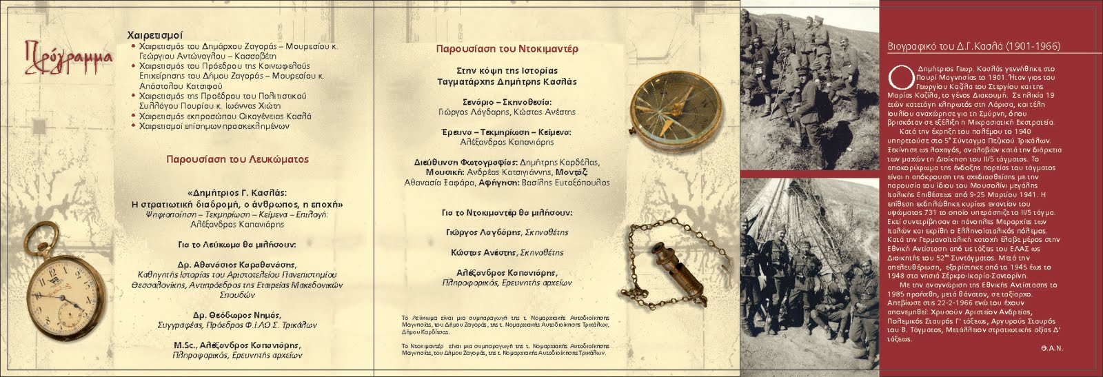 Ειδικότερα η εκδήλωση θα παρουσιασθεί στο προαύλιο του πρώην Δημοτικού Σχολείου Πουρίου και το πρόγραμμα αναλυτικά περιλαμβάνει: α) η παρουσίαση του λευκώματος με τίτλο «Δημήτριος Γ. Κασλάς: Η στρατιωτική διαδρομή, ο άνθρωπος, η εποχή» την υπογραφή του οποίου φέρει ο Αλέξανδρος Καπανιάρης (Ψηφιοποίηση, Τεκμηρίωση, Κείμενα, Επιλογή), β) η επίσημη παρουσίαση και προβολή του ντοκιμαντέρ με τίτλο «Στην κόψη της ιστορίας: ταγματάρχης Δημήτρης Κασλάς». Το σενάριο και τη σκηνοθεσία του ντοκιμαντέρ υπογράφουν ο Γεώργιος Λάγδαρης και ο Κώστας Ανέστης, την έρευνα, τεκμηρίωση και τα κείμενα ο Αλέξανδρος Καπανιάρης, η διεύθυνση φωτογραφίας είναι του Δημήτρη Κορδελά, η μουσική του Ανδρέα Κατσιγιάννη, το μοντάζ της Αθανασίας Ξαφάρα και η αφήγηση του ηθοποιού Βασίλη Ευταξόπουλου.