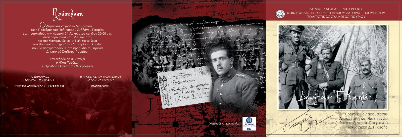 Στην γενέτειρα του Δ. Γ. Κασλά στο Πουρί, Δημοτικό Διαμέρισμα του Δήμου Ζαγοράς – Μουρεσίου θα πραγματοποιηθεί την Κυριακή 21/08 και ώρα 20:00 μ.μ παρουσίαση λευκώματος και ντοκιμαντέρ με θέμα την ζωή και το έργο του Πουριανού Ταγματάρχη.