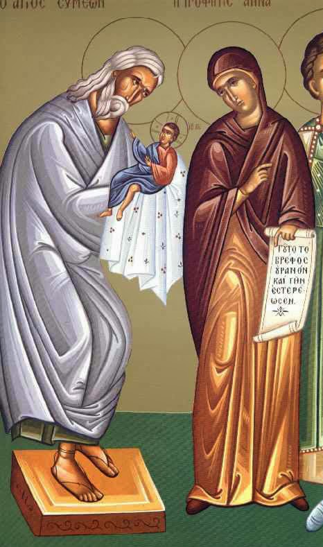 Ο Συμεών κατοικούσε στην Ιερουσαλήμ. Ήταν δίκαιος, ευλαβής και φωτισμένος από το Άγιο Πνεύμα, που του είχε φανερώσει ότι δε θα πέθαινε πριν δει το Χριστό. Η χαρμόσυνη αυτή πληροφορία τον εμψύχωνε ως τα βαθειά γεράματα του. Τέλος, ακριβώς σαράντα μέρες μετά τη γέννηση του Ιησού, το Πνεύμα τον πληροφόρησε ότι έπρεπε να πάει στο Ιερό. Ετοιμάστηκε, λοιπόν, με νεανική ζωηρότητα, πήγε εκεί και στάθηκε στην πόρτα, γεμάτος ευχαρίστηση και αγαλλίαση. Μέσα στην προσδοκία αυτή, φάνηκαν να έρχονται ο Ιωσήφ με την Παρθένο, που κρατούσε τον Ιησού. Ο Συμεών, πληροφορημένος από το Πνεύμα ότι το βρέφος αυτό είναι ο Χριστός, τρέχει και παίρνει τον Ιησού στην αγκαλιά του. Τον κρατάει ευλαβικά και, αφού καλά – καλά παρατήρησε το νήπιο και δέχθηκε όλη την ιλαρότητα της θείας μορφής του, ύψωσε το βλέμμα του επάνω και είπε ευχαριστώντας το Θεό: «Νυν απολύεις τον δούλον σου, Δέσποτα, κατά το ρήμα σου εν ειρήνη· ότι είδον οι οφθαλμοί μου το σωτήριόν σου, ο ητοίμασας κατά πρόσωπον πάντων των λαών, φως εις άποκάλυψιν εθνών και δόξαν λάου σου Ισραήλ». Τώρα, δηλαδή, πάρε την ψυχή μου Δέσποτα, σύμφωνα με το λόγο σου, ειρηνικά, διότι τα μάτια μου είδαν αυτόν που θα φέρει τη σωτηρία που ετοίμασες για όλους τους λαούς και θα είναι γι’ αυτούς φως, που θα αποκαλύψει τον αληθινό Θεό και θα δοξάσει το λαό σου Ισραήλ.