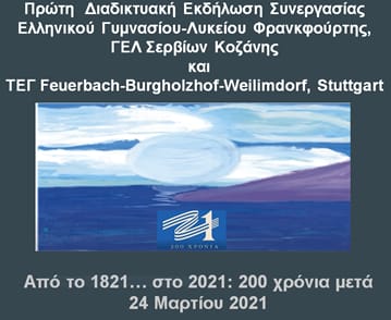 Η γιορτή για την Πατρίδα έφερε κοντά -παρά τα 2000 χιλιόμετρα -τα τρία σχολεία, το Γενικό Λύκειο Σερβίων, το Ελληνικό Γυμνάσιο-Λύκειο Φρανκφούρτης και τα Τμήματα Ελληνικής Γλώσσας Feuerbach–Burgholzhof–Weilimdorf. Σε μια συνάντηση λογοτεχνική, μουσική και ιστορική οι μαθητές στις 24 Μαρτίου 2021, ώρα Ελλάδας 10:30, αντάλλαξαν τα μηνύματα της επανάστασης του 1821 προβάλλοντάς τα στο 2021.