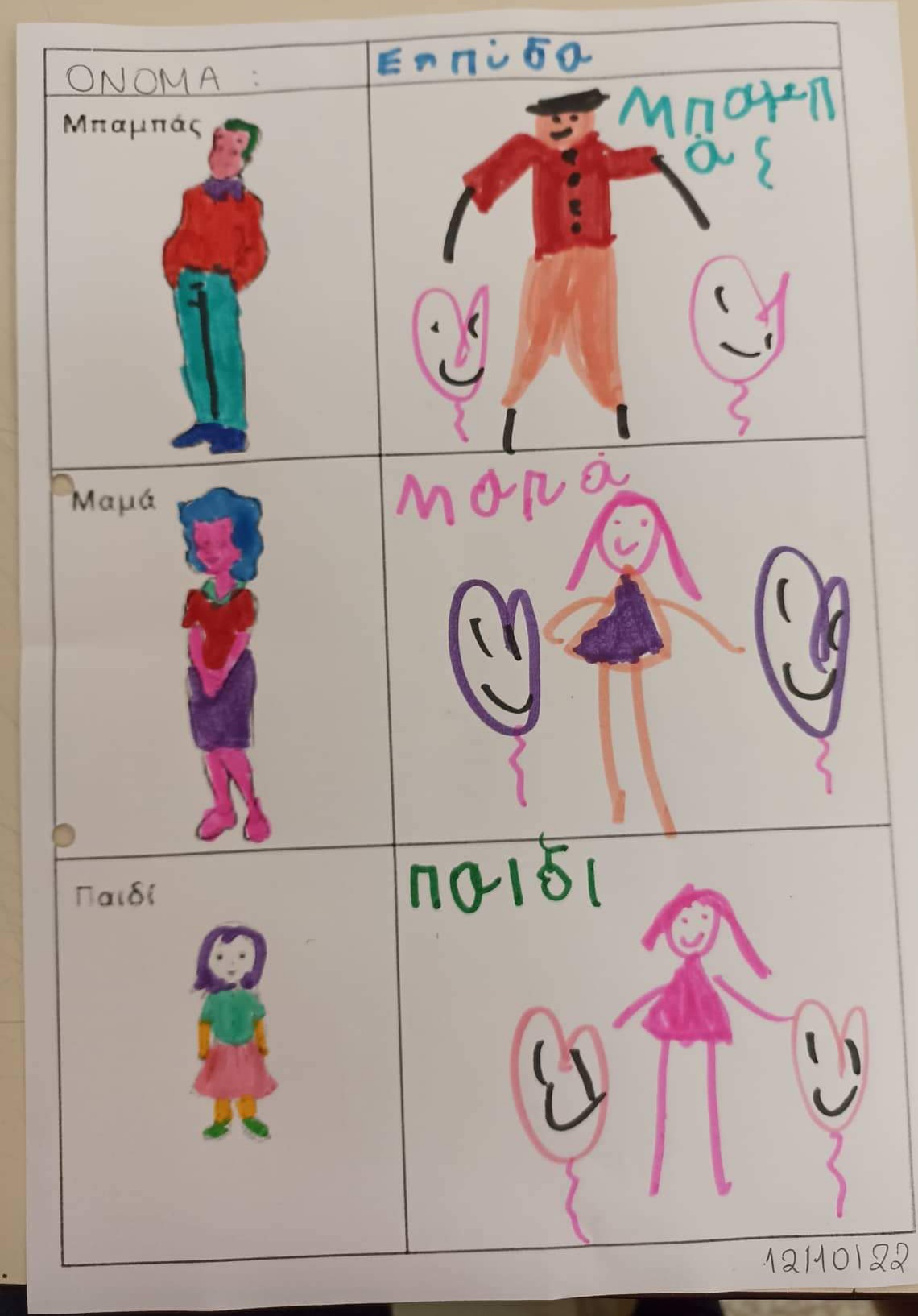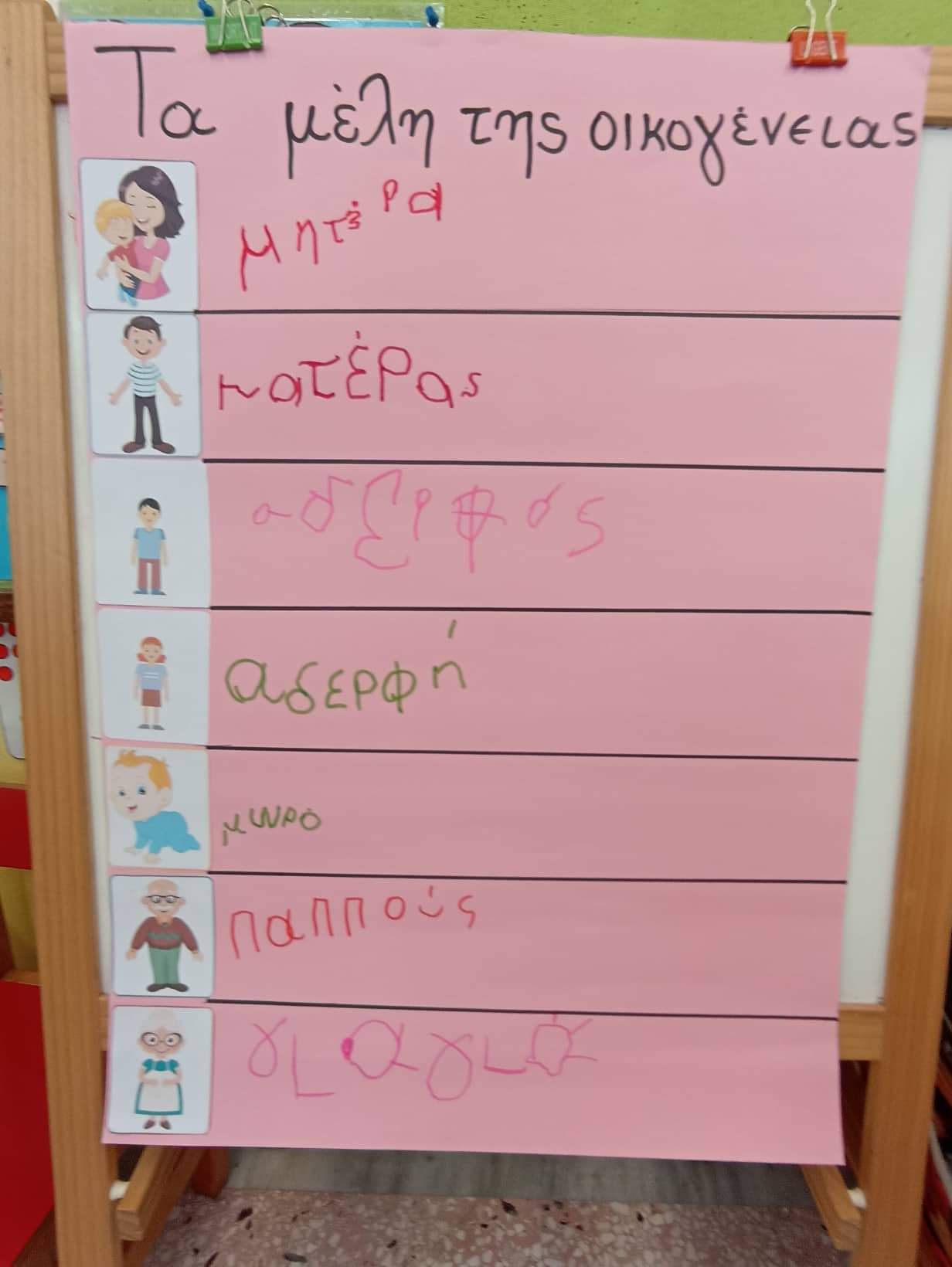 Σιγά σιγά μαθαίνουμε να ταυτιζουμε όμοιες λέξεις ,να τις αντιγράφουμε και να τις αναγνωριζουμε.Ετσι ασχοληθήκαμε με το λεξιλόγιο των μελών της οικογένειας σε ομαδικό πρώτα και κατόπιν σε ατομικό επίπεδο.