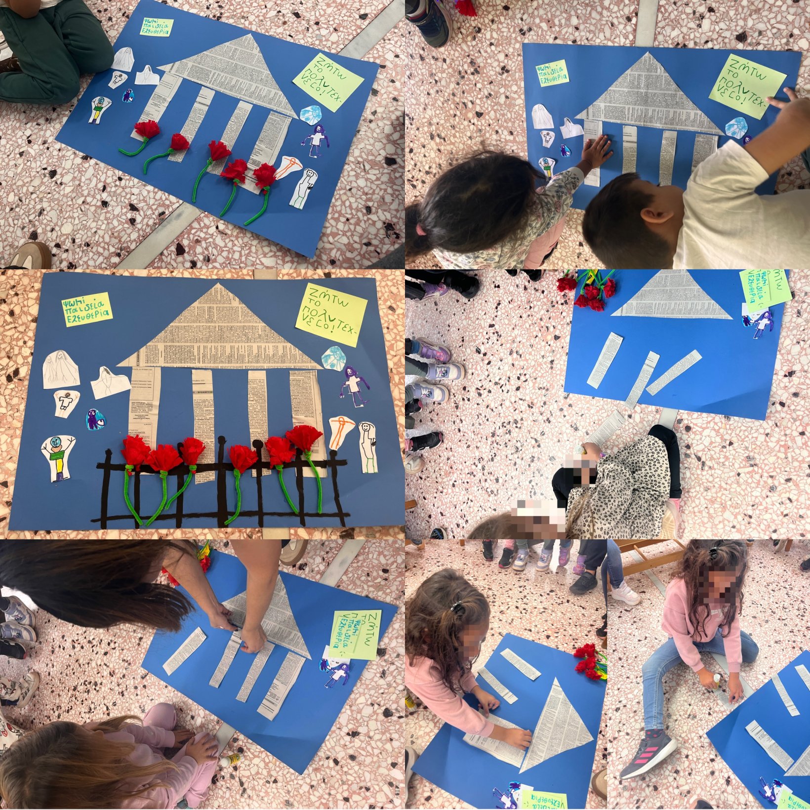 Ολοκληρώσαμε τη θεματική με μια ομαδική κατασκευή του Πολυτεχνείου, χρησιμοποιώντας εφημερίδες και διάφορα υλικά, δημιουργώντας ένα συγκινητικό και συμβολικό έργο.