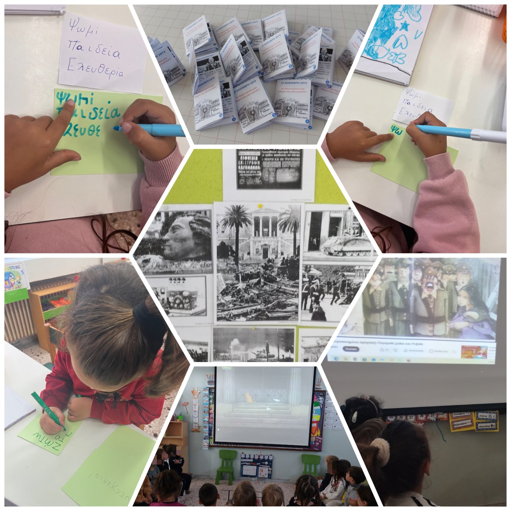 Με απλό και κατανοητό τρόπο εξηγήσαμε στα παιδιά τις βασικές συνθήκες της εποχής και τι έγινε στις 17 Νοέμβριου το 1973 καθώς και τα συνθήματα που φώναζαν οι φοιτητές.