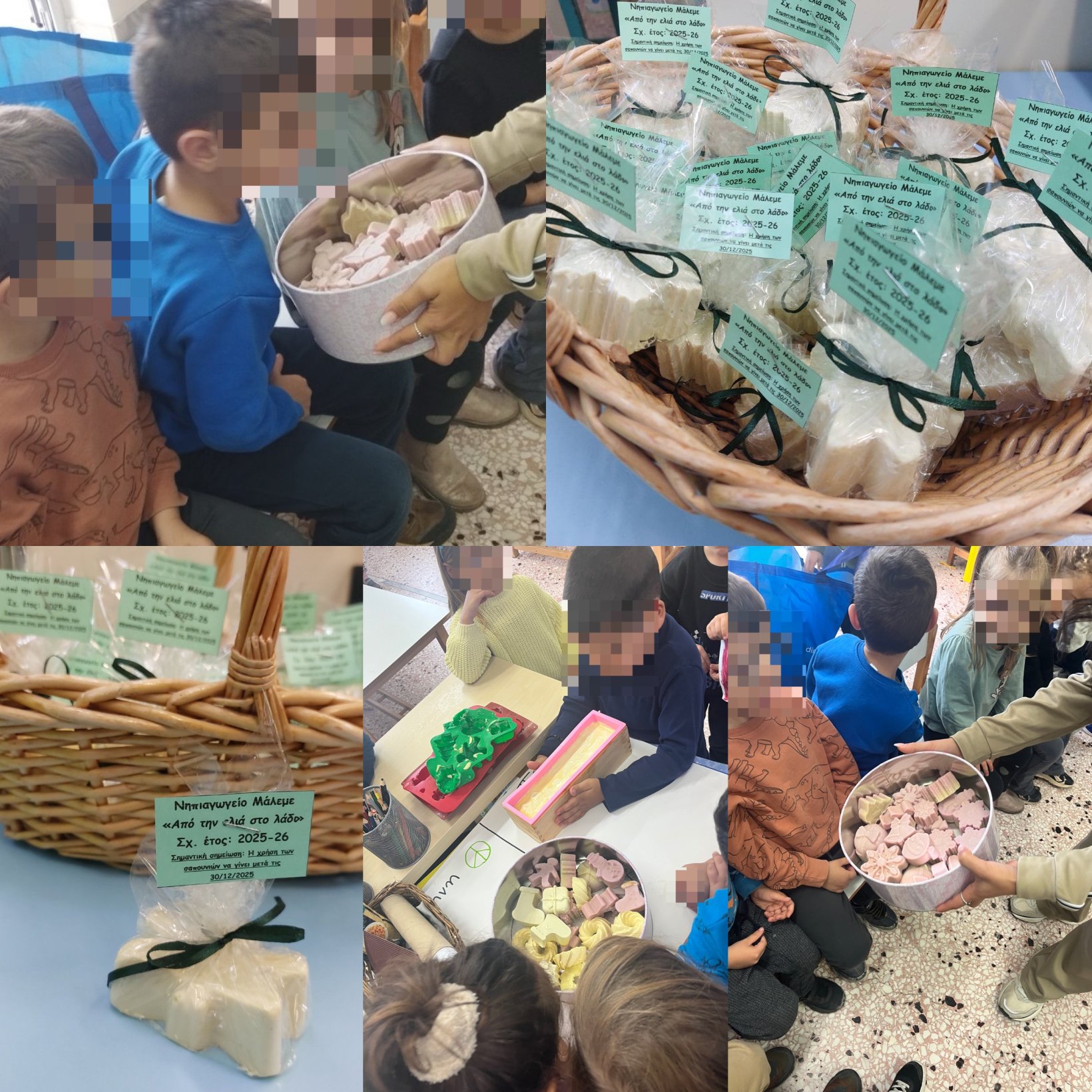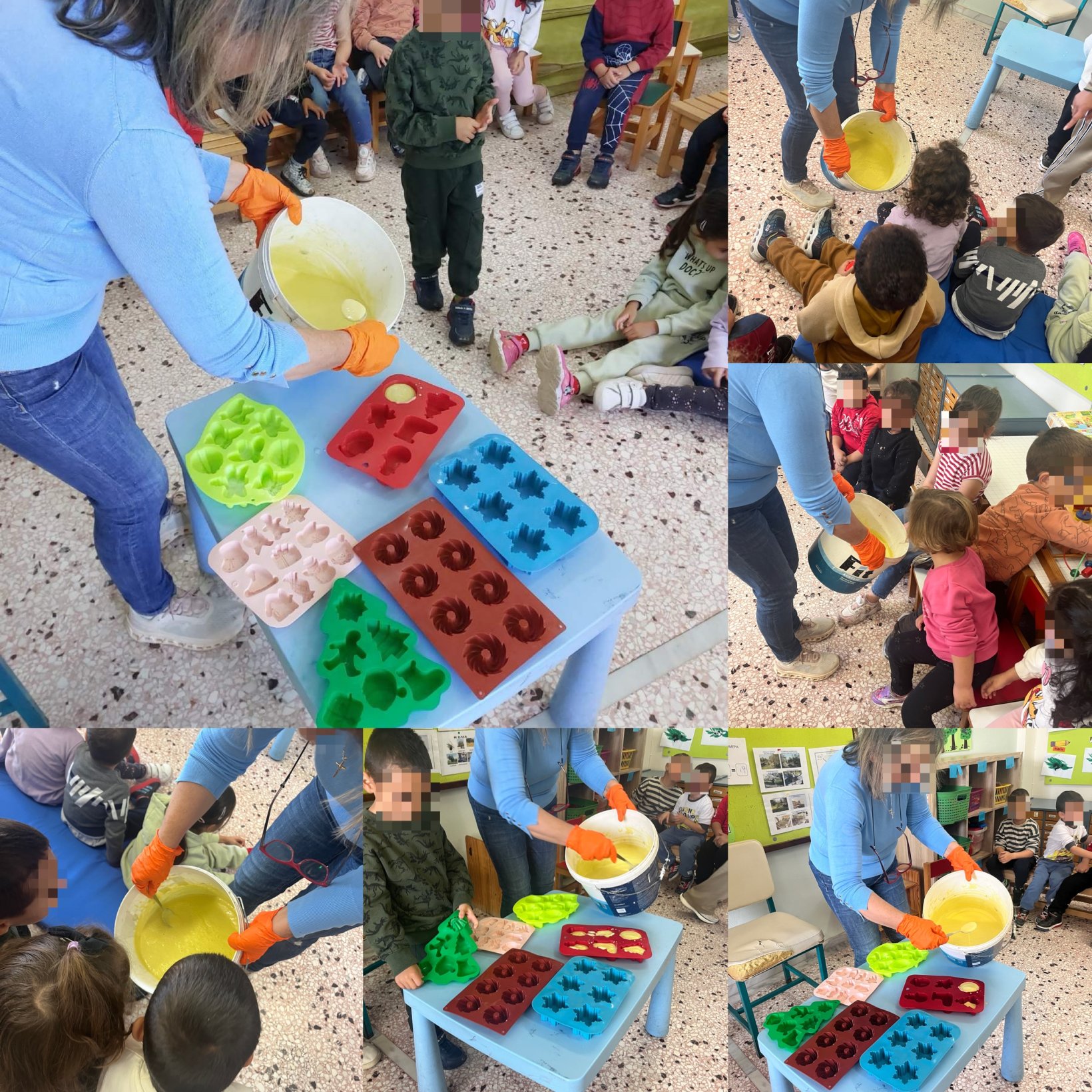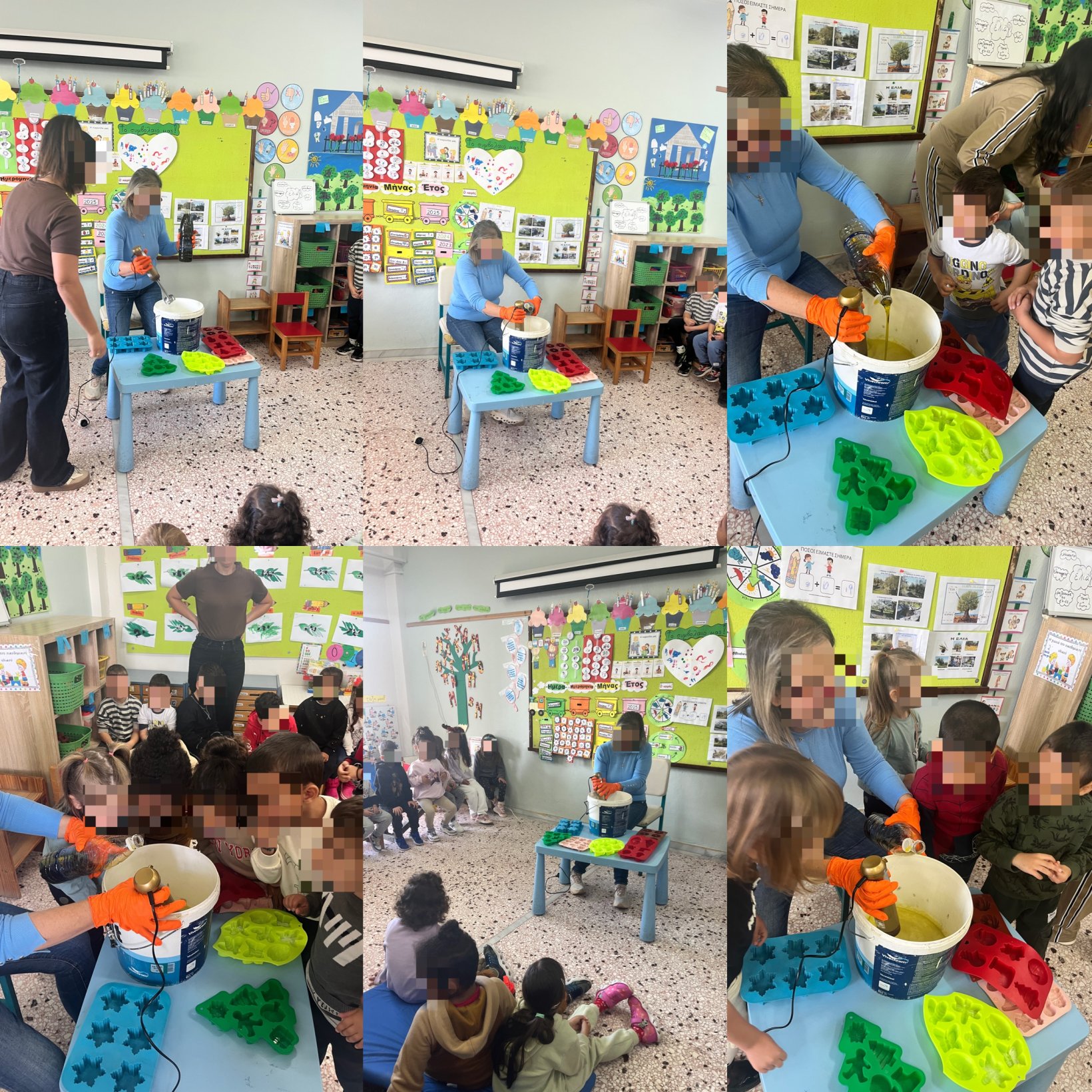 Μία από τις πιο αξέχαστες στιγμές ήταν η επίσκεψη της γιαγιάς ενός παιδιού, η οποία ήρθε στο νηπιαγωγείο και μας έδειξε πώς φτιάχνουμε χειροποίητο σαπούνι. Τα παιδιά παρακολούθησαν με ενθουσιασμό και έμαθαν πώς ένα προϊόν της ελιάς μπορεί να μεταμορφωθεί σε κάτι καθημερινό και χρήσιμο.