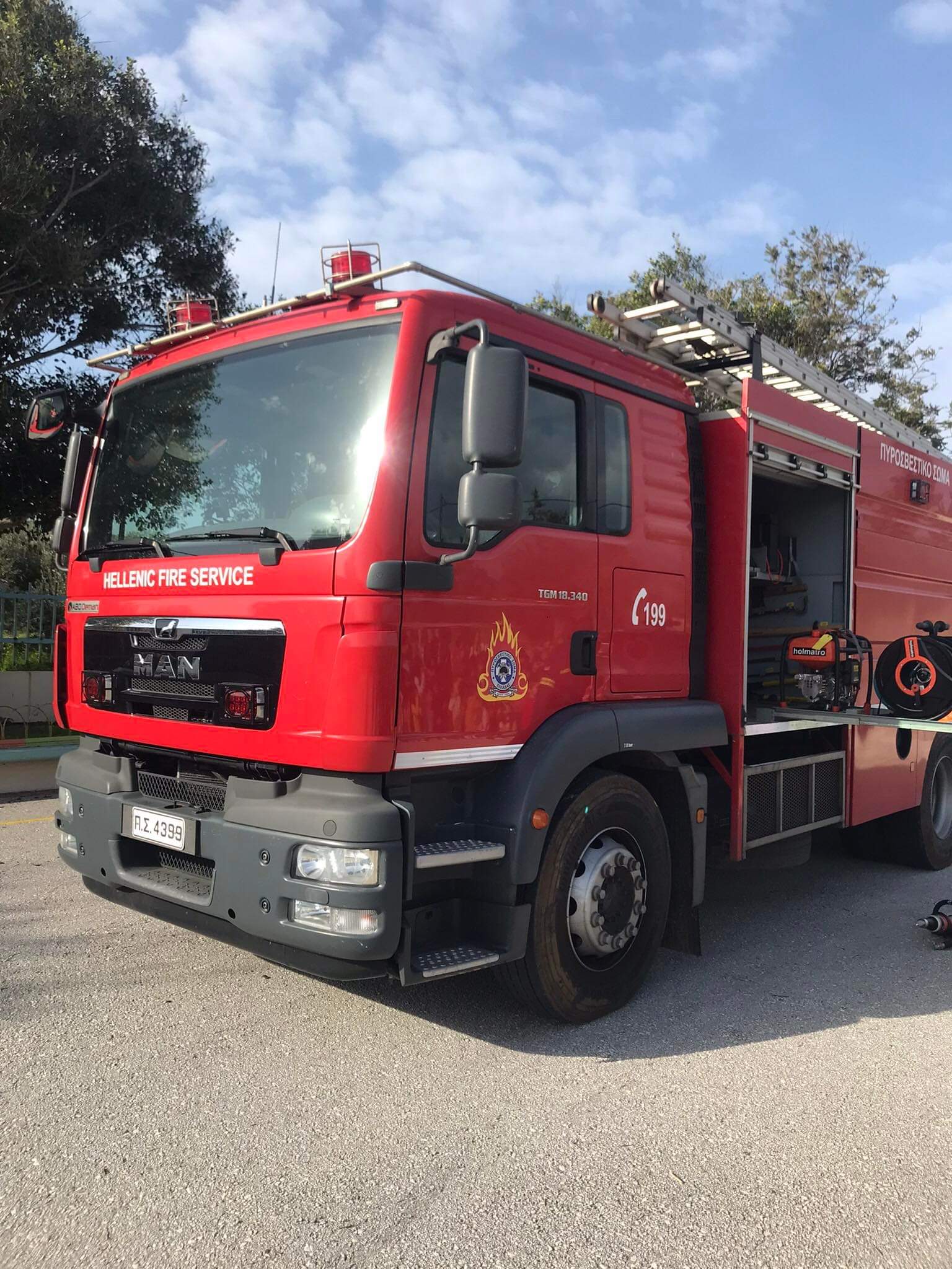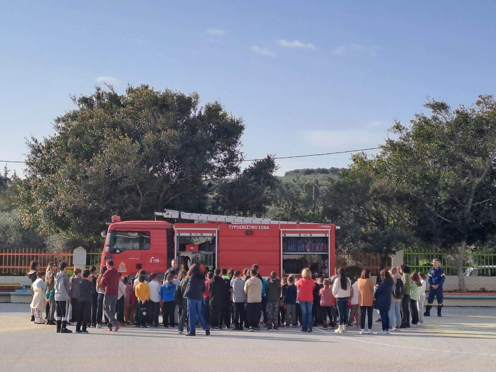 Κατοπιν ακολούθησε στην αυλή του σχολείου, επίδειξη ενος πυροσβεστικου οχήματος. Παρουσιάστηκε στα παιδιά και απαντηθηκαν οι αποριες τους.Φυσικα ειδαν πως ρίχνει νερό με τη μανικα και άκουσαν τους ήχους της σειρηνας του, γεγονός που τα ενθουσίασε ιδιαίτερα.