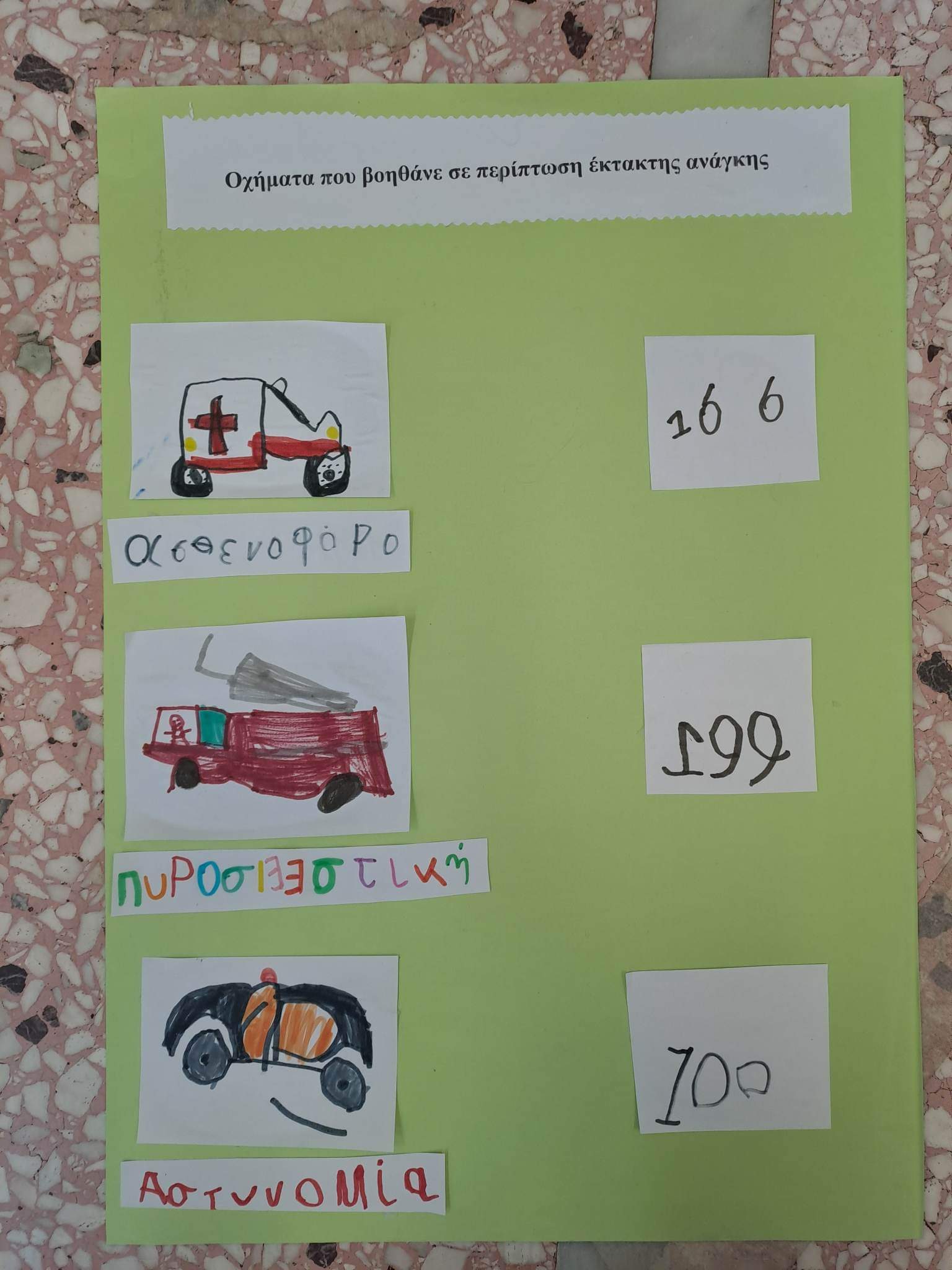Πριν την επίσκεψη οι μαθητές γνωρισαν τα οχήματα,τις αρμοδιότητες και τον τηλεφωνικό αριθμό των 3 υπηρεσιών που καλούμε σε περίπτωση έκτακτης ανάγκης.