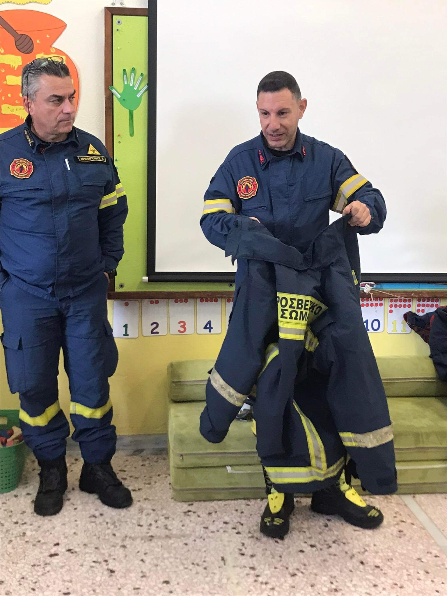 Με μεγάλη χαρά τους υποδεχτηκαμε αρχικά στην τάξη μας , όπου μέσα από μια εκπαιδευτική ιστορία, τα παιδιά έμαθαν τι να αποφεύγουν, ώστε να μην προκληθεί μια πυρκαγιά, αλλά και για τον σωστό τρόπο προστασίας τους σε περίπτωση μίας.