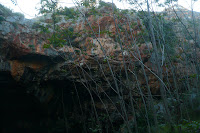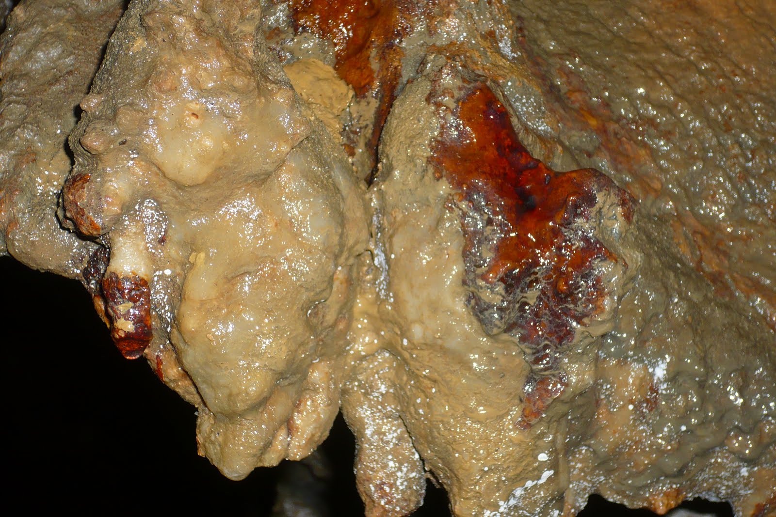 Εδώ κι εκεί, αποκαλυπτόμενοι στο φως, οι χρωματισμοί των τοιχωμάτων. Αλλού πρασινωποί από την υγρασία, όπου φτάνει ακόμα το λιγοστό φως της εισόδου, αλλού κάτασπροι, αλλού ιριδίζοντες και αλλού κατακόκκινοι σα φωτιά, Σε ορισμένα σημεία μάλιστα έντονες σταλιές κόκκινου, σαν αίμα. Και δε θέλει πολύ η σκέψη, οδηγημένη από την τολμηρή φαντασία να ταξιδέψει παρασυρμένη από τα ερεθίσματα του χώρου. Μια αιμορραγία…
