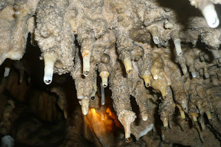 Σταλαχτίτες και σταλαγμίτες ενώνονται σχηματίζοντας κολώνες που ενώνουν το πάτωμα με την οροφή του σπηλαίου. «Τα σαγόνια του καρχαρία», «η φιάλη», «η ακέφαλη λύκαινα» είναι ονομασίες που σχηματίζονται αυθόρμητα στο μυαλό μου. Πέτρινοι όγκοι, αγάλματα που στραφταλίζουν στο τεχνητό φως του φακού, κι ας μην υπάρχει κανείς να τα δει και να τα θαυμάσει. Χωρίς πολλούς παρατηρητές, χωρίς να ζητούν δημοσίευση, στη μοναξιά και στην απουσία των άλλων, με υπομονή και τέχνη δημιουργούν τα δικά τους θαύματα και περιμένουν…