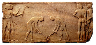 Ανάγλυφο με σκηνή αθλοπαιδιάς (χόκεϊ) στη βάση αγάλματος κούρου. 500-490 π.Χ. Αθήνα, Εθνικό Αρχαιολογικό Μουσείο 3477. ΥΠ.ΠΟ./ΤΑΠ. Σπαθάρη, Έ., Το Ολυμπιακό πνεύμα, εκδόσεις ΑΔΑΜ, Αθήνα 1992, σ. 188. ©ΥΠ.ΠΟ. (πηγή: ΙΜΕ)