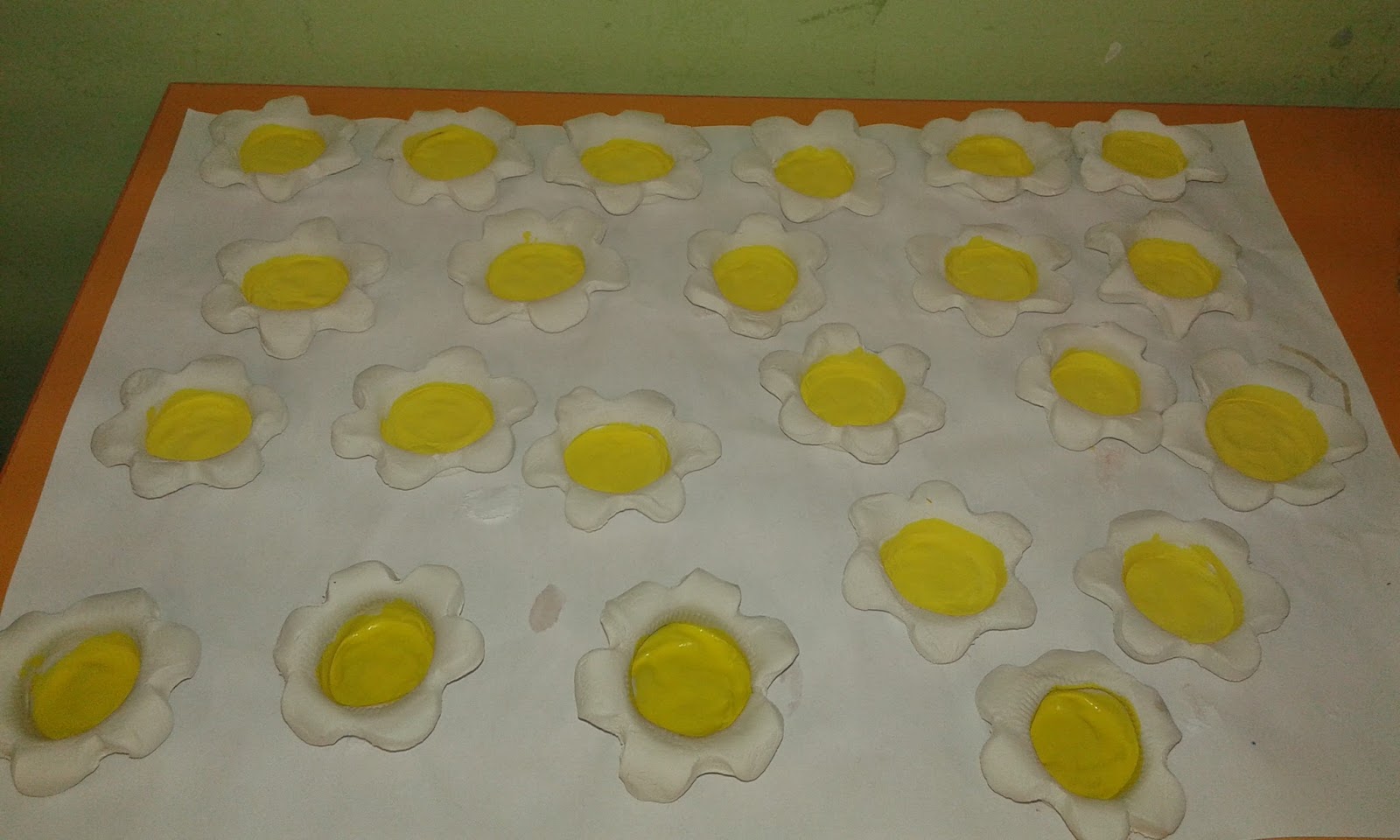 Οι αυγοθήκες μας….με πηλό κι αυτές!!! Κόβουμε με κουπάτ σε σχήμα λουλούδι τον πηλό και στην συνέχεια πατάμε με καπάκι στο κέντρο για να σχηματιστεί η βάση…λίγη κίτρινη τέμπερα κι έτοιμη η αυγοθήκη μας!!!