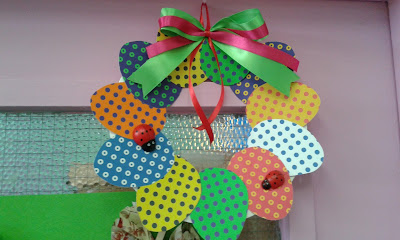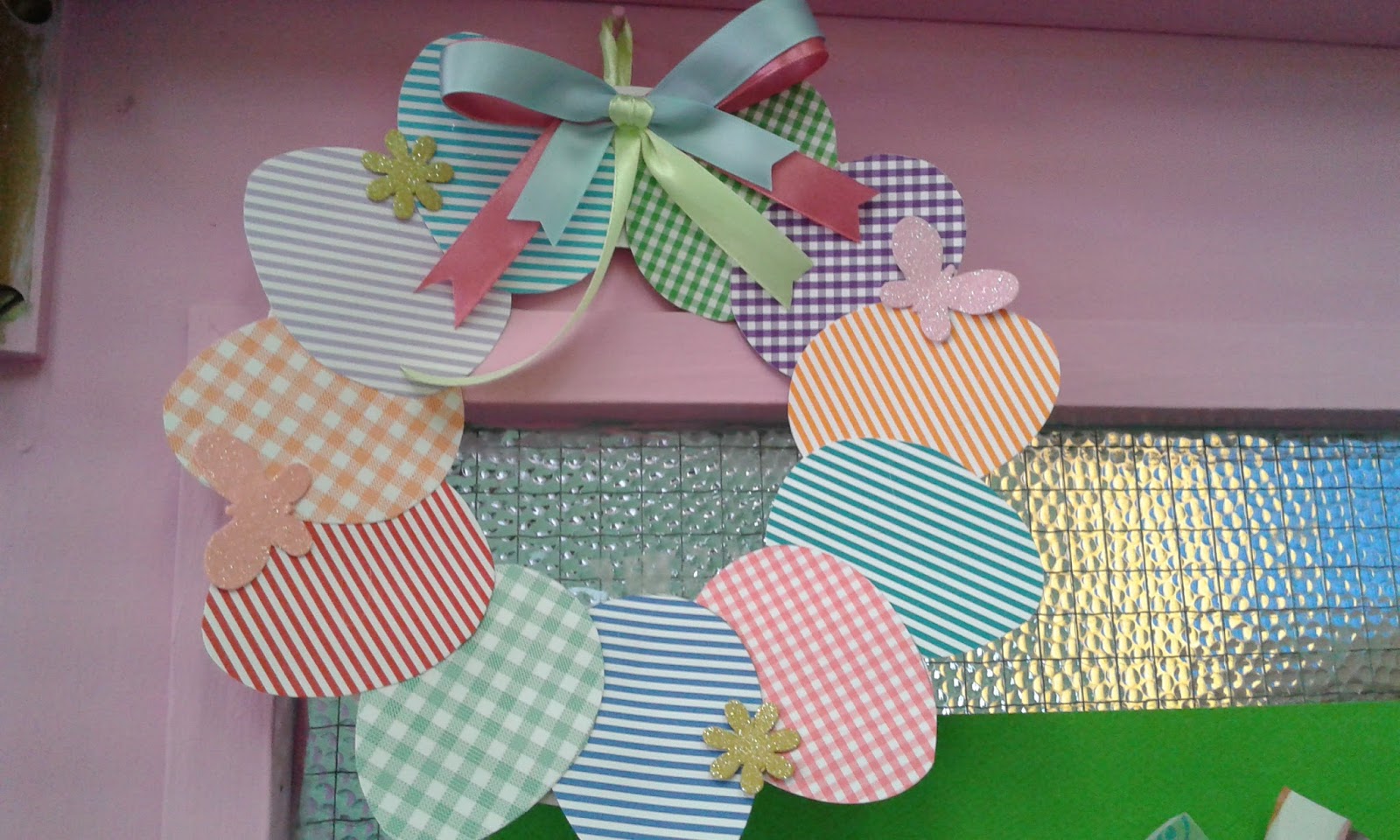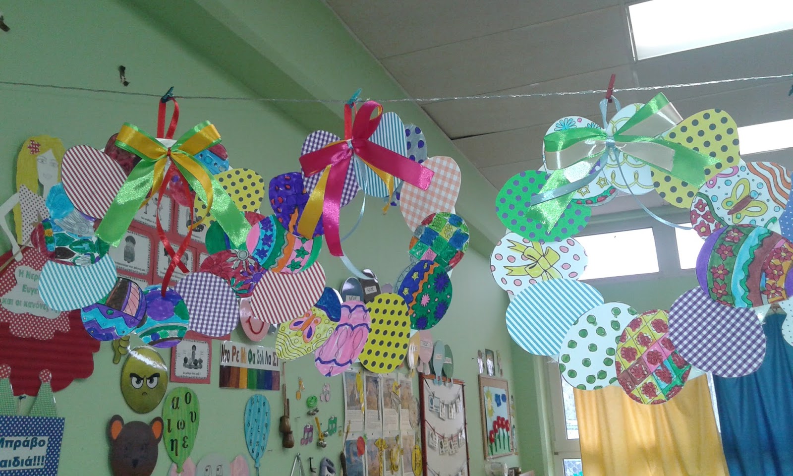 Και τα κλασικά αυγουλοστεφάνια!!!!!Χαρτόνια με σχέδια και αυγουλάκια με σχέδια που χρωμάτισαν τα παιδιά, δημιούργησαν ένα χαρούμενο πασχαλινό στεφάνι…..τα φιογκάκια της κυρίας!!!
