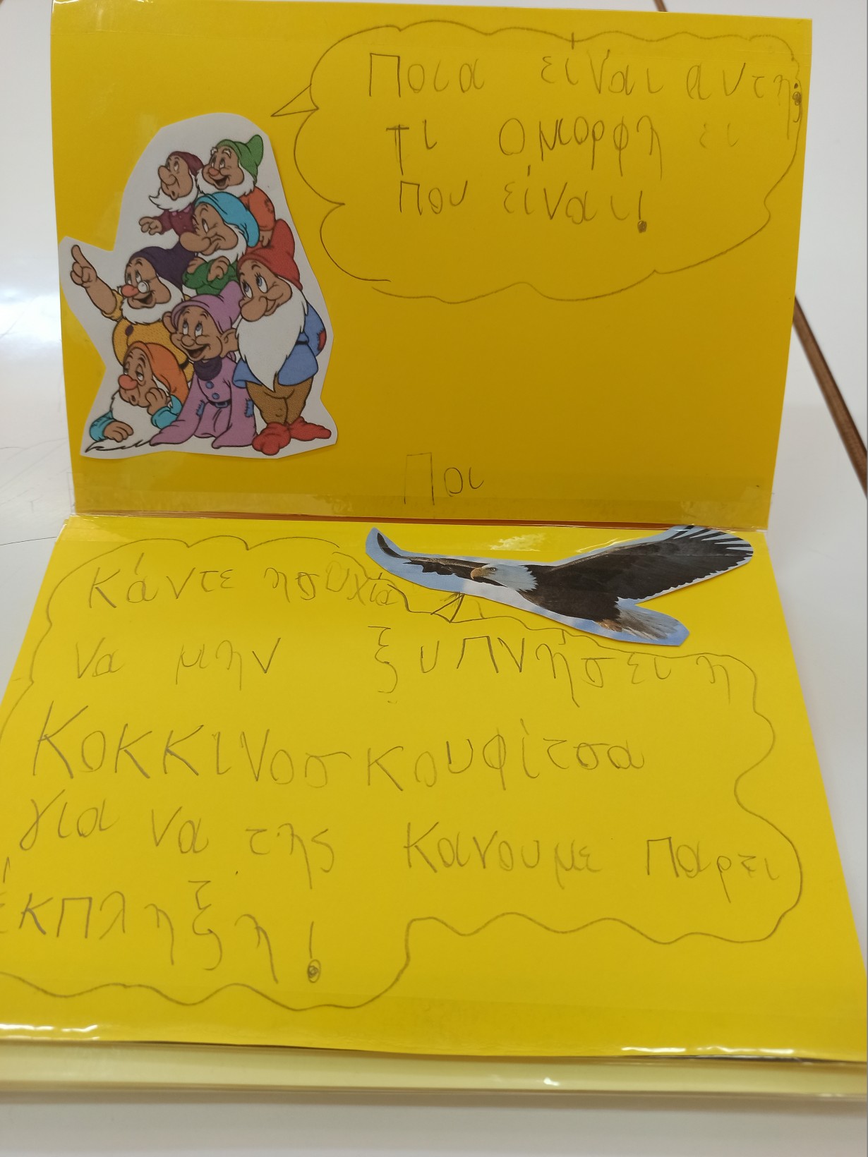 Η δική μας Κοκκινοσκουφίτσα, λοιπόν, συνάντησε στο δάσος έναν μαγεμένο αετό που την πήγε στο σπίτι των νάνων….