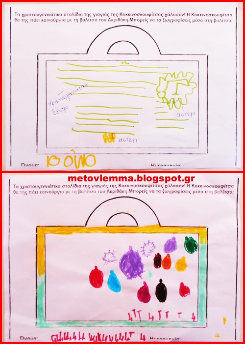 Βαλίτσα από κομμάτι χαρτόκουτου , το οποίο βάφτηκε με τέμπερες και πάνω του κολλήθηκαν έργα των παιδιών.