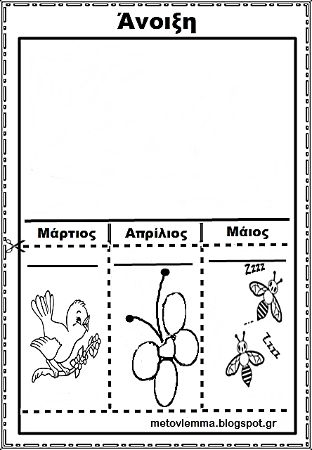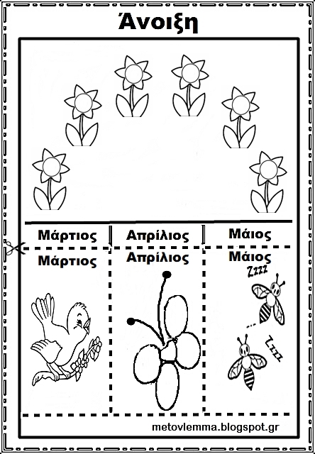 Ζωγραφίζουμε μέσα στο κενό παραλληλόγραμμο μια ανοιξιάτικη εικόνα,αντιγράφουμε το όνομα του κάθε μήνα στην αντίστοιχη γραμμή που βρίσκεται κάτω από το όνομά του και ακολουθούμε τις γενικές οδηγίες.