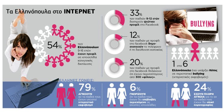 Σύμφωνα με το παρακάτω Infographic 54% των Ελληνόπουλλων 9-16 ετών έχουν προφίλ σε ιστοσελίδα κοινωνικής δικτύωσης, 33% των παιδιών 9-12 ετών διατηρούν ψεύτικο προφίλ στο Facebook, 12% των παιδιών που έχουν προφίλ στο Facebook έχουν κοινοποιήσει το τηλέφωνο και τη διεύθυνση κατοικίας τους ενώ 20% των παιδιών έχουν περισσότερους από 300 “φίλους”.