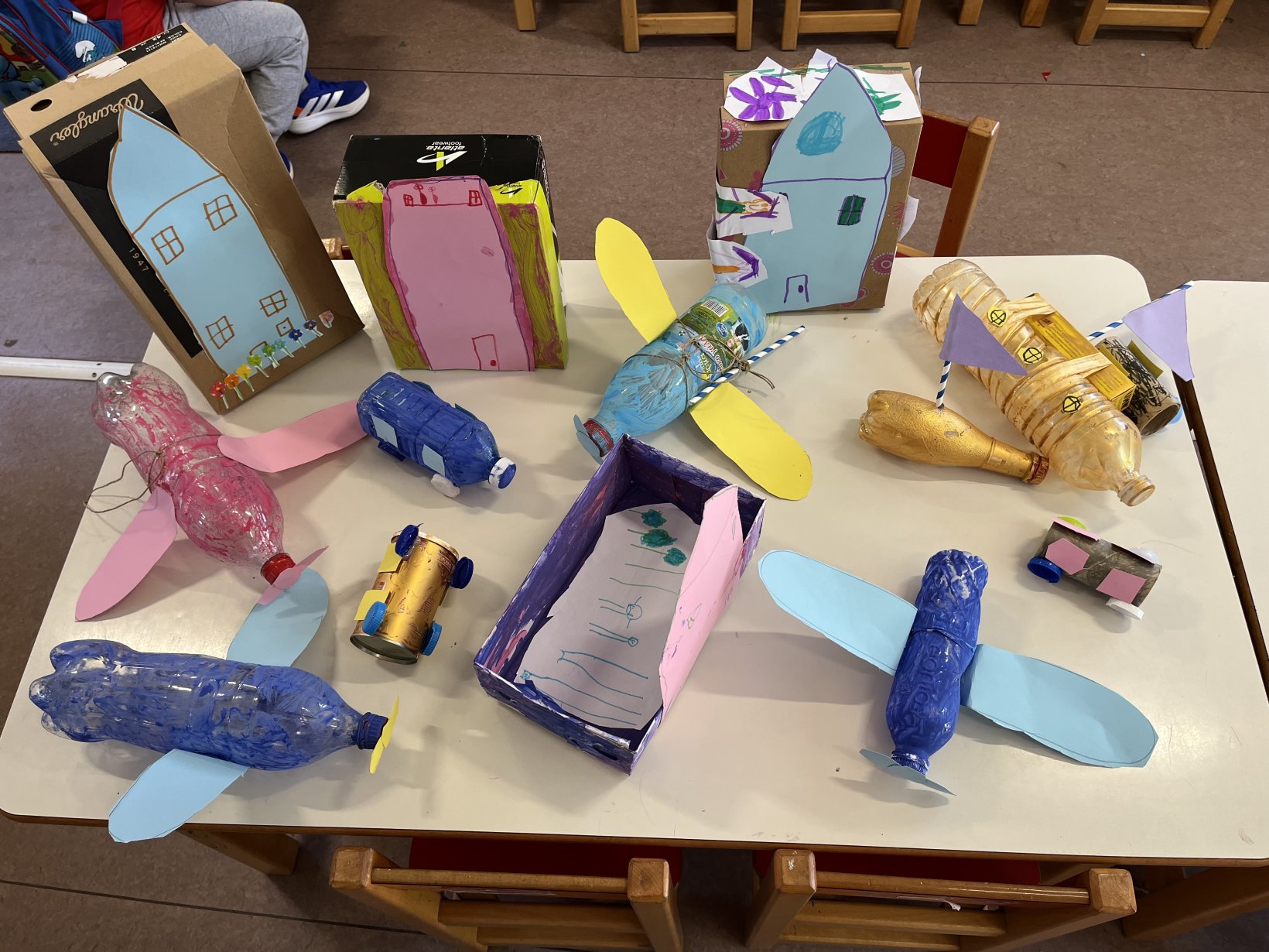 Τέλος, με ανακυκλώσιμα σκουπίδια που έφεραν οι μαθητές από το σπίτι τους δημιούργησαν κατασκευές και παιχνίδια! Τα παιδιά ενθουσιάστηκαν πολύ με το αποτέλεσμα!!!