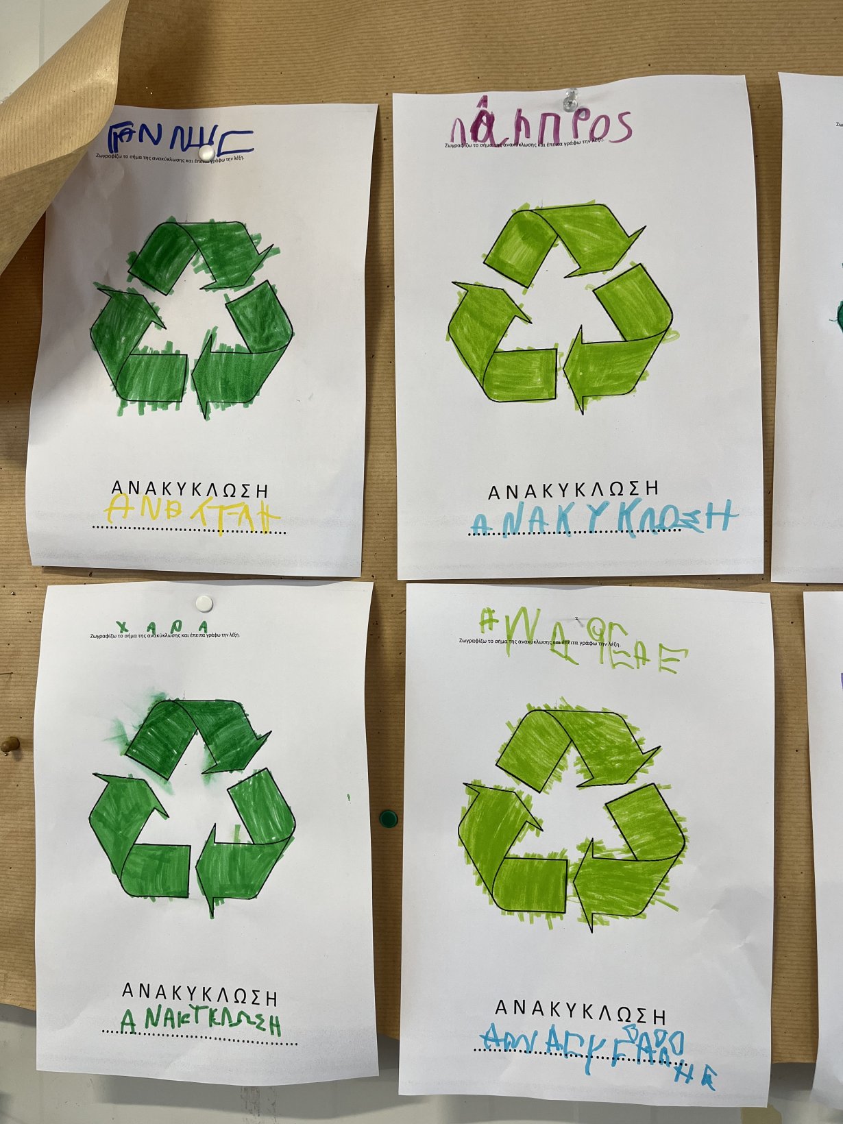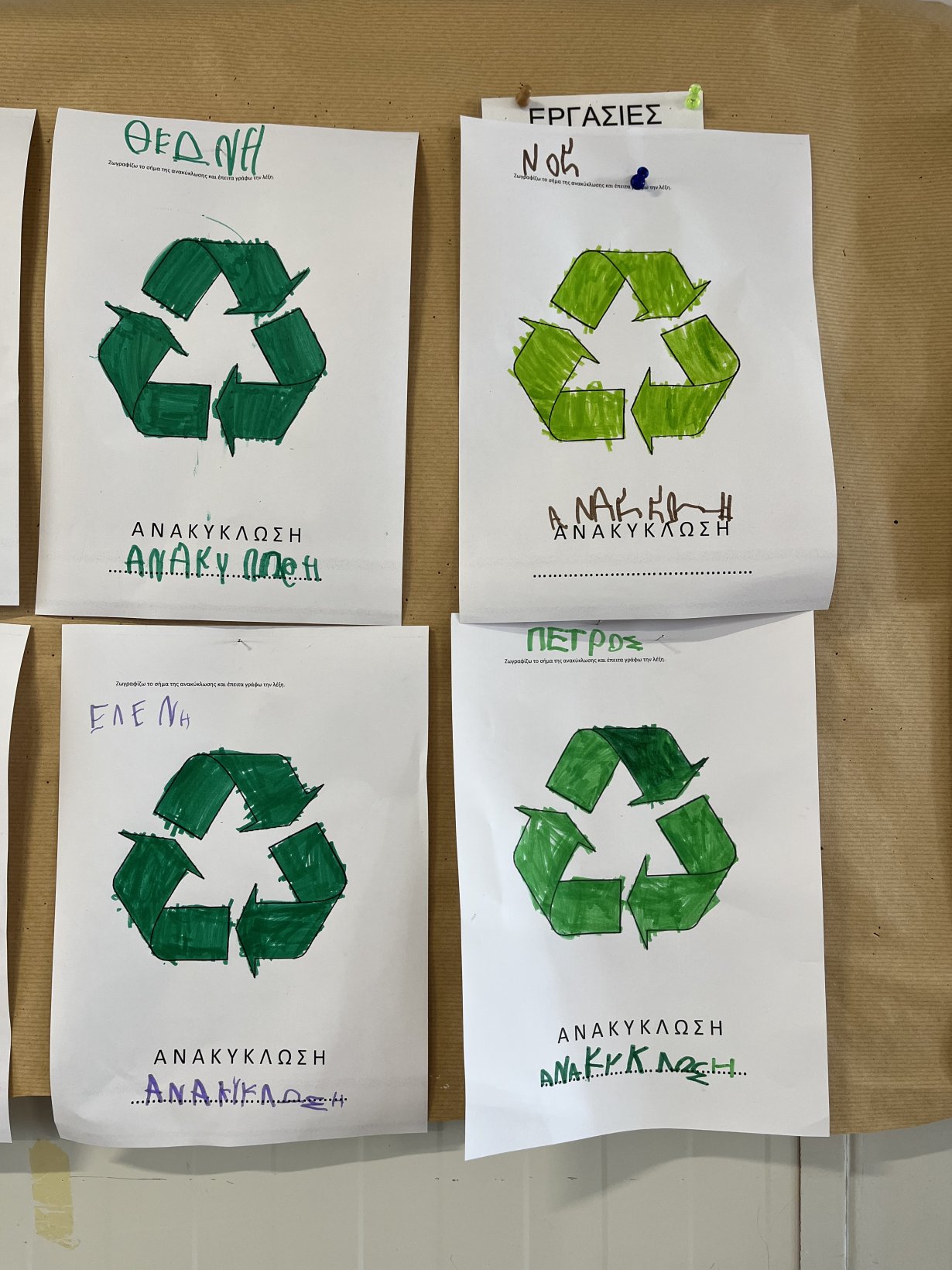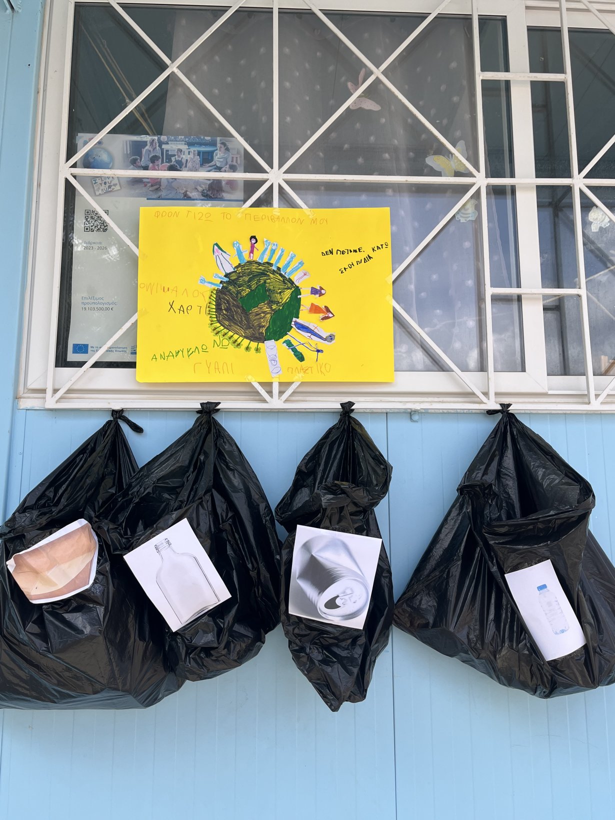 Αποφάσισαν να φτιάξουν μια ομαδική αφίσα για να ευαισθητοποιήσουν την τοπική κοινότητα. Εκτός από την αφίσα τοποθετήσαν και σακούλες διαφορετικές για κάθε ανακυκλώσιμο υλικό με σκοπό την συλλογή ανακυκλώσιμων σκουπιδιών.