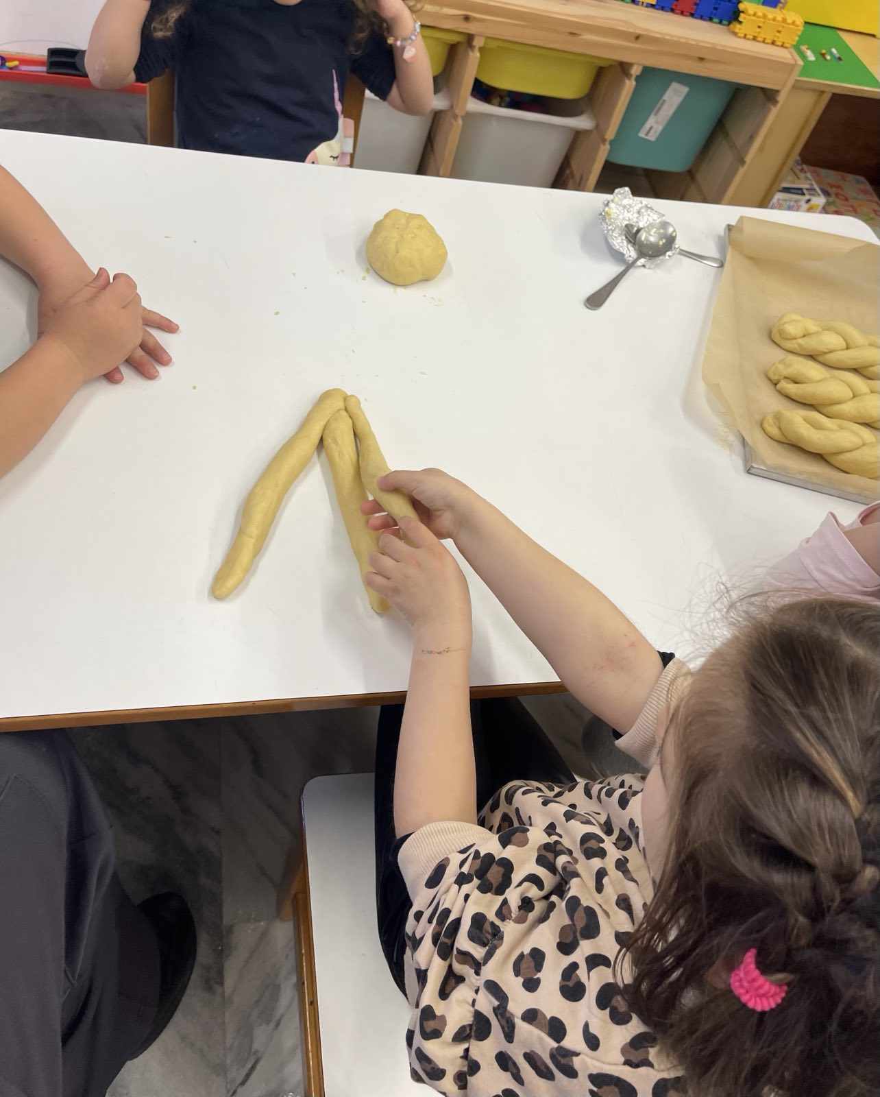 Στη συνέχεια, περάσαμε στη δράση, συμμετέχοντας σε αγαπημένες πασχαλινές δραστηριότητες. Το κάθε παιδί έφτιαξε τη δική του ξεχωριστή λαμπάδα, διακοσμώντας την με χρώματα, κορδέλες και μικρά στολίδια. Βάψαμε αυγά με παραδοσιακό τρόπο, γεμίζοντας το νηπιαγωγείο με ανοιξιάτικες αποχρώσεις και ενθουσιασμό. Δεν έλειψε και η παρασκευή πασχαλινών τσουρεκιών: τα μικρά χεράκια βοήθησαν να πλάσουμε τη ζύμη και να στολίσουμε τα τσουρέκια μας με σουσάμι και κόκκινα αυγά.