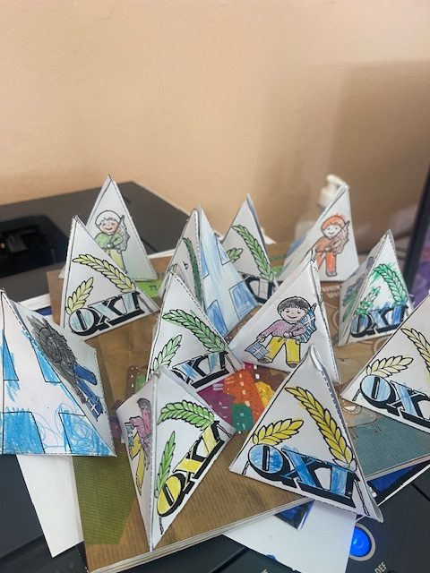 Δημιουργήσαμε κατασκευές με σημαίες, στεφάνια και περιστέρια, γεμίζοντας την τάξη με μπλε και λευκό!