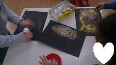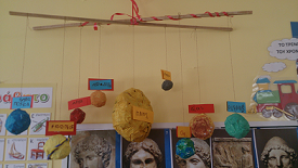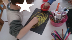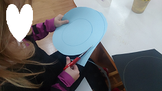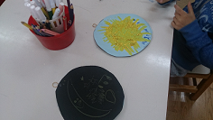 Μιλώντας για την εναλλαγή μέρας και νύχτας κάναμε και ένα μόμπιλ, που απο τη μια πλευρά της γης είναι ο λαμπερός ήλιος και απο την άλλη το φεγγαράκι με τα αστέρια του. Δίνουμε στα παιδιά δύο όμοιους κύκλους, τον ένα σε γαλάζιο χαρτόνι και τον άλλο σε μαύρο.