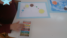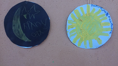 Αφού κόψουν τους κύκλους, στο γαλάζιο χαρτόνι τα παιδιά ζωγραφίζουν έναν ήλιο και γράφουν “Καλημέρα” και στο μαύρο ζωγραφίζουν το φεγγαράκι με τα αστέρια του και γράφουν “Καληνύχτα”.