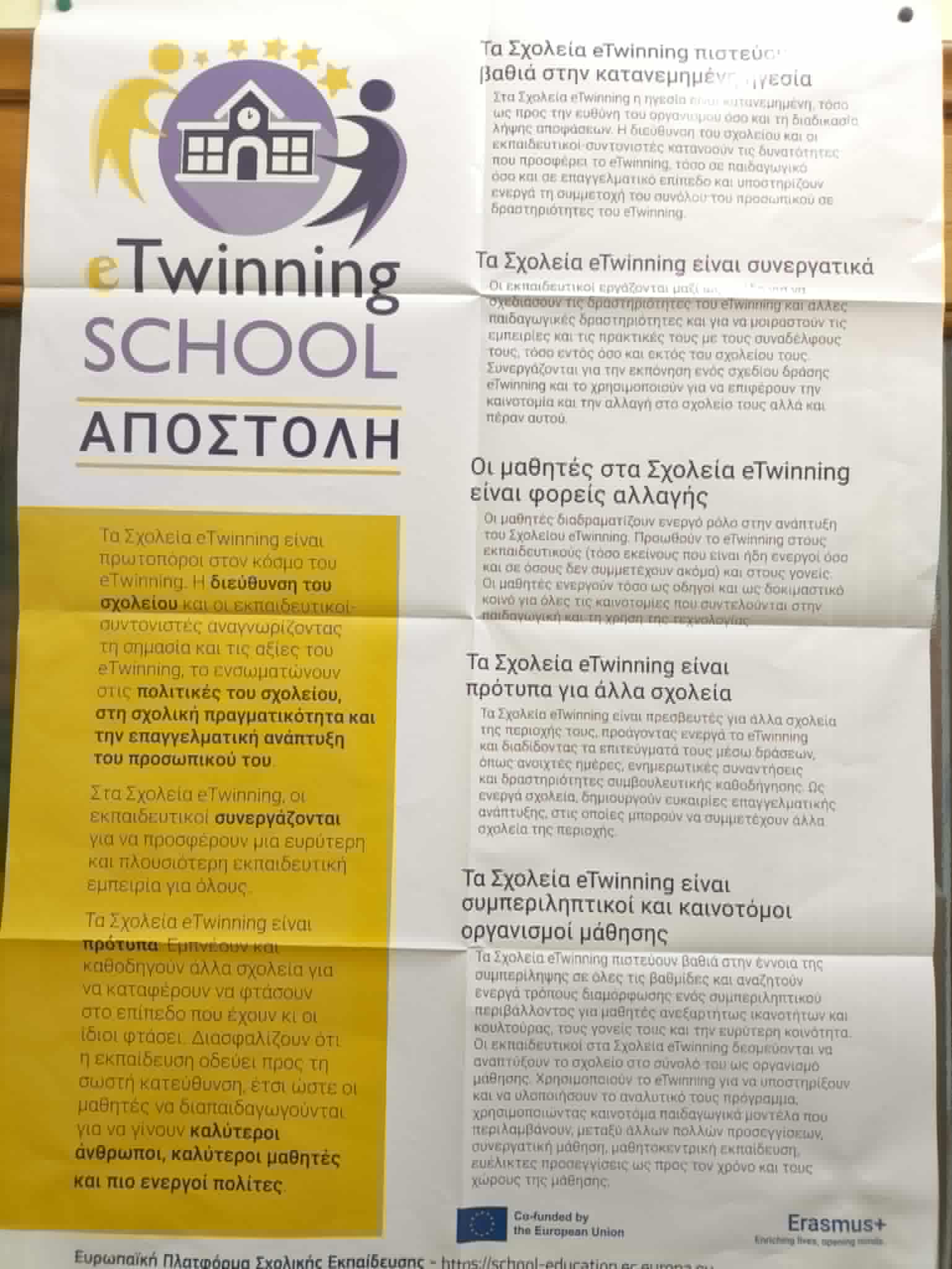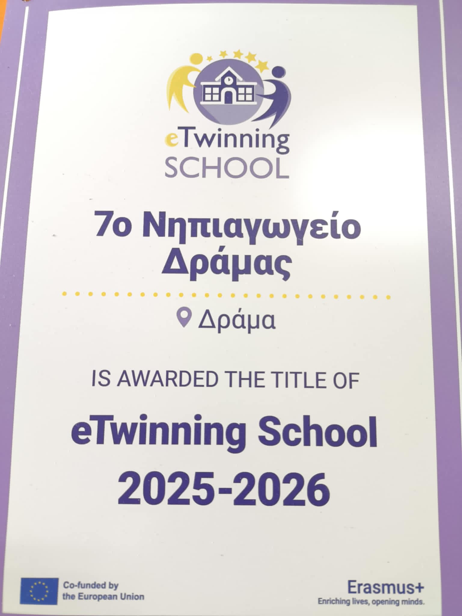 eTWINNING SCHOOL 2025-2026 Είμαστε πολύ περήφανοι που απονεμήθηκε στο Νηπιαγωγείο μας ο τίτλος του eTwinning School 2025-2026. Είναι η επιβράβευση των προσπάθειών μας για την υλοποίηση έργων e-Twinning τα τελευταία τρία χρόνια.