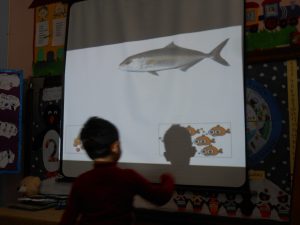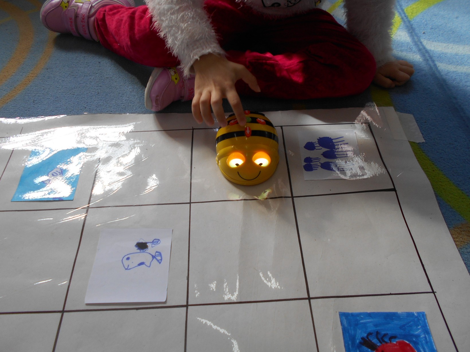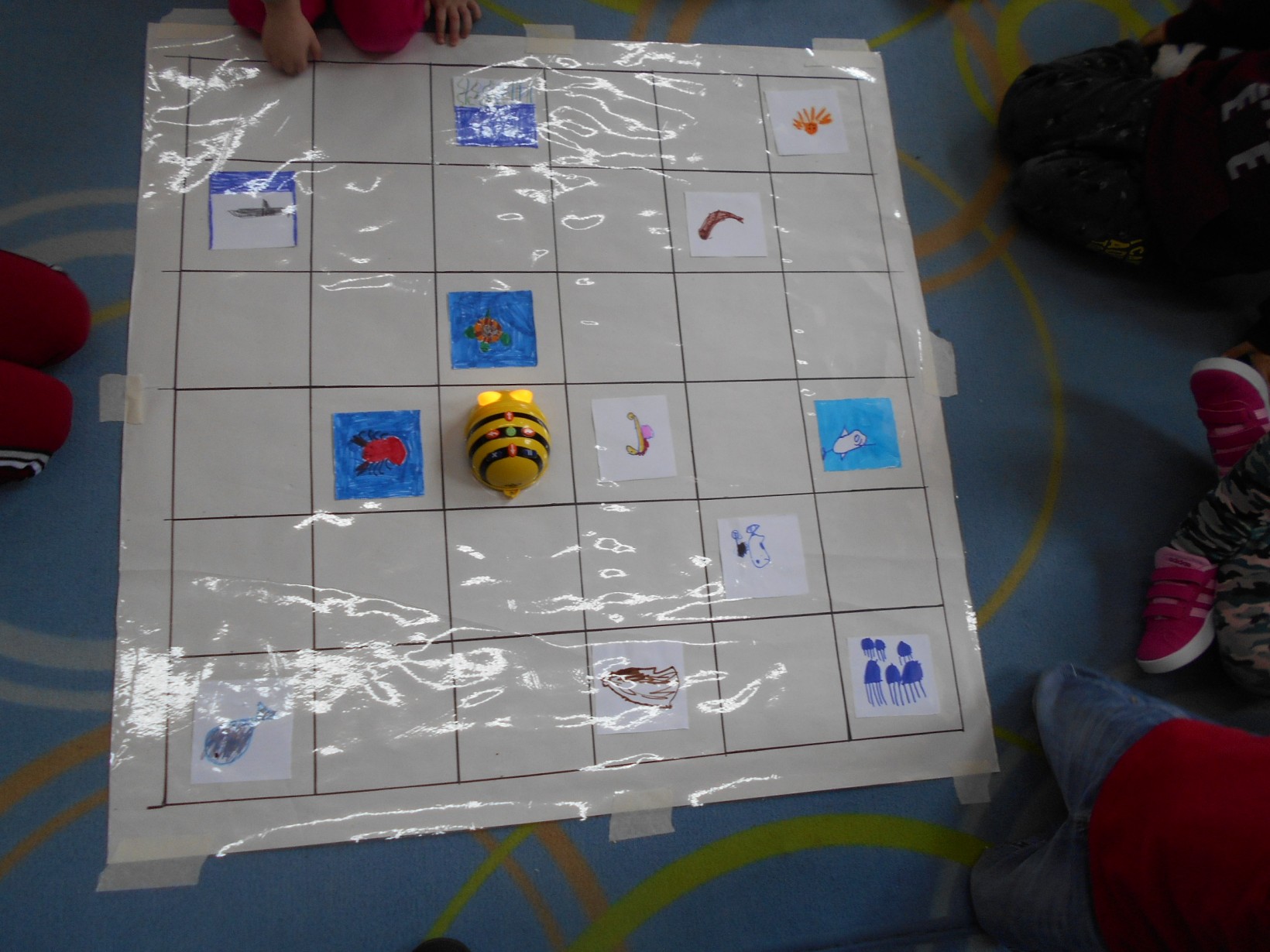 Στη συνέχεια ζωγράφισαν τα πλάσματα της θάλασσας και οι ζωγραφιές τους τοποθετήθηκαν στο πλέγμα της BeeBot. Ένα ένα με τη σειρά προγραμμάτισαν τη μελισσούλα να περάσει από το θαλάσσιο οργανισμό της αρεσκείας του.