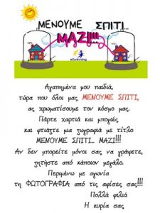 Στη δύσκολη περίοδο που διανύουμε, με παιδιά και γονείς κλεισμένα στο σπίτι το σχολείο μας συμμετέχει στο eTwinning έργο με τίτλο “Μένουμε στο σπίτι….μαζί”. Μέσα από το συγκεκριμένο έργο εκπαιδευτικοί από όλη την Ελλάδα συμμετέχουν και επικοινωνούν με τους μαθητές τους με σκοπό να ξεπεράσουν την κρίση που δημιουργήθηκε λόγω της πανδημίας.