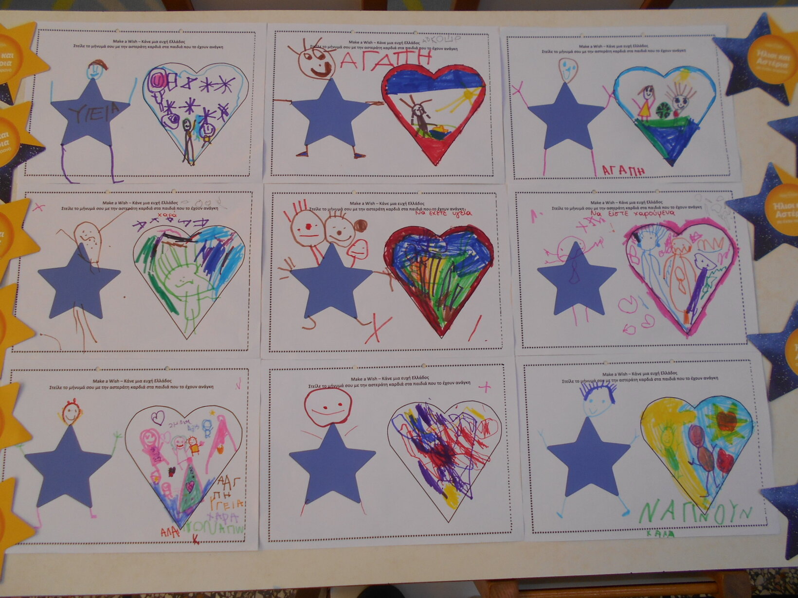 Τα παιδιά ξάπλωσαν με τα μάτια κλειστά και έβαλα να ακούγεται μουσική. Πέρασα και άφησα δίπλα σε κάθε παιδί ένα αστεράκι ενώ ταυτόχρονα τους έλεγα τα εξής λόγια: «Είναι φορές που στη ζωή συμβαίνουν θαύματα. Είναι φορές που οι άνθρωποι γίνονται η δύναμη ο ένας για τον άλλο. Είναι φορές που η δύναμη αυτή τους κάνει να χορεύουν ακόμα και αν στη ζωή τους περνούν την πιο δύσκολη καταιγίδα. Είναι τότε που η καρδιά τους γεμίζει φως. Είναι τότε που μέσα τους ανάβει το δικό τους αστέρι. Ένα αστέρι που γίνεται φως και για τους άλλους ανθρώπους…ένα φως που πολλαπλασιάζεται για να δώσει δύναμη σε όσους/όσες το χρειάζονται. Ένα φως που κατοικεί και στη δική τους καρδιά. Είναι το φως που ανάβει στην ψυχή του κάθε εθελοντή/τριας. Ένα τέτοιο αστέρι ήρθε και κατοίκησε σήμερα δίπλα σας με την ευχή να βρει χώρο να κατοικήσει και μέσα σας-δίπλα στην καρδιά σας και να την κάνει να κτυπά πιο δυνατά, ενσυναίσθητα, πιο αστεράτα και φωτεινά. Ανοίξτε τα μάτια σας και καλωσορίστε το αστέρι σας. Σκάστε του ένα χαμόγελο και ελάτε να περπατήσουμε μαζί του στον δρόμο της ζωής και της προσφοράς».