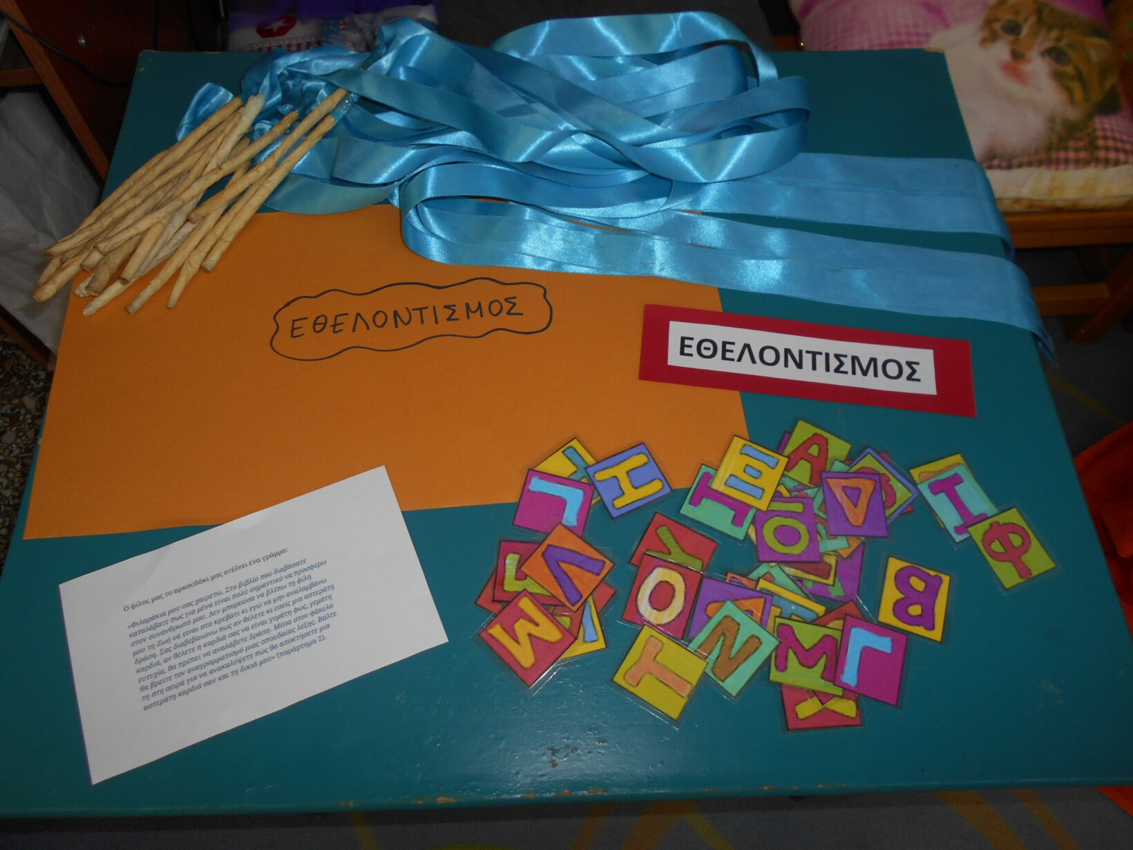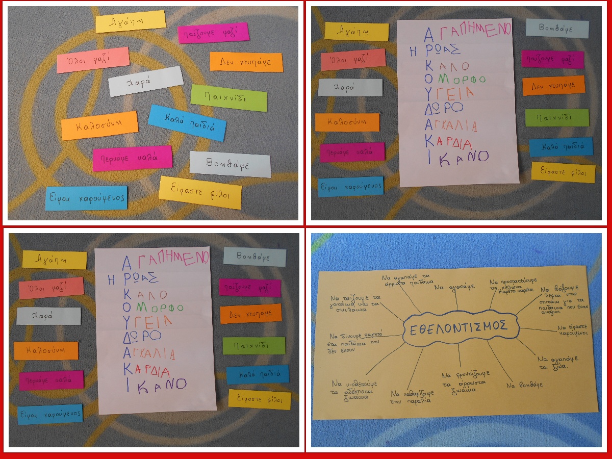 Τα παιδιά σειροθετούν τα γράμματα που τους παρουσιάζουμε και αποκαλύπτεται η λέξη εθελοντισμός. Πολλά είναι αυτά που κάνουν την ψυχή μας να «χορεύει». Ένα από τα πιο δυνατά μυστικά συστατικά είναι ο εθελοντισμός. Τι είναι ο εθελοντισμός; Τα παιδιά εκφράζουν ελεύθερα τις απόψεις τους. Δημιουργούμε μια ιδεοθύελλα με λέξεις-φράσεις που τους έρχονται στο μυαλό ακούγοντας τη λέξη εθελοντισμός. Ζωγράφισαν τα γράμματα της λέξης και τη σχημάτισαν. Διαπίστωσαν ότι είναι πολύ μεγάλη. Έτσι τη μετρήσαμε. Πόσα παιδιά ξαπλωμένα χρειάζονται για να σχηματίσουμε τη λέξη; Πόσα καθιστά;
