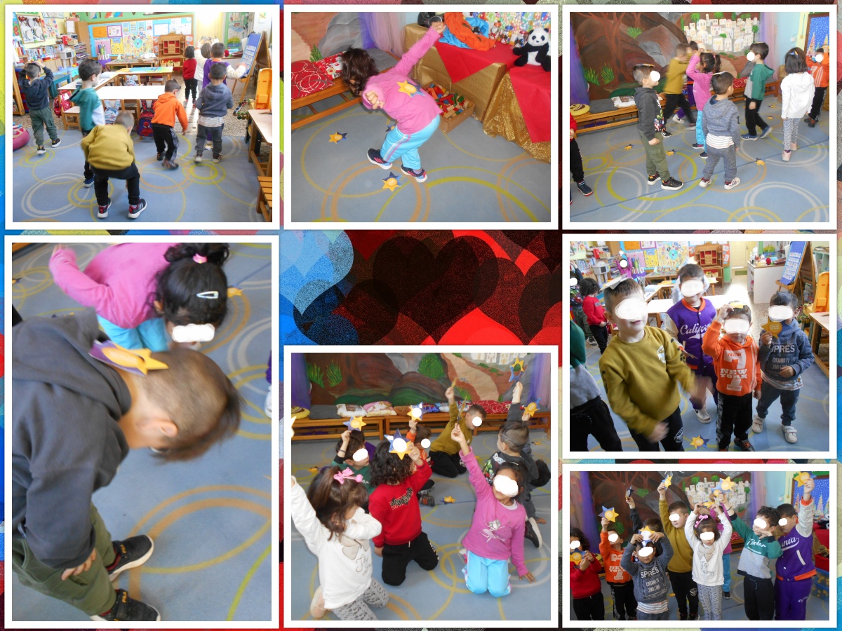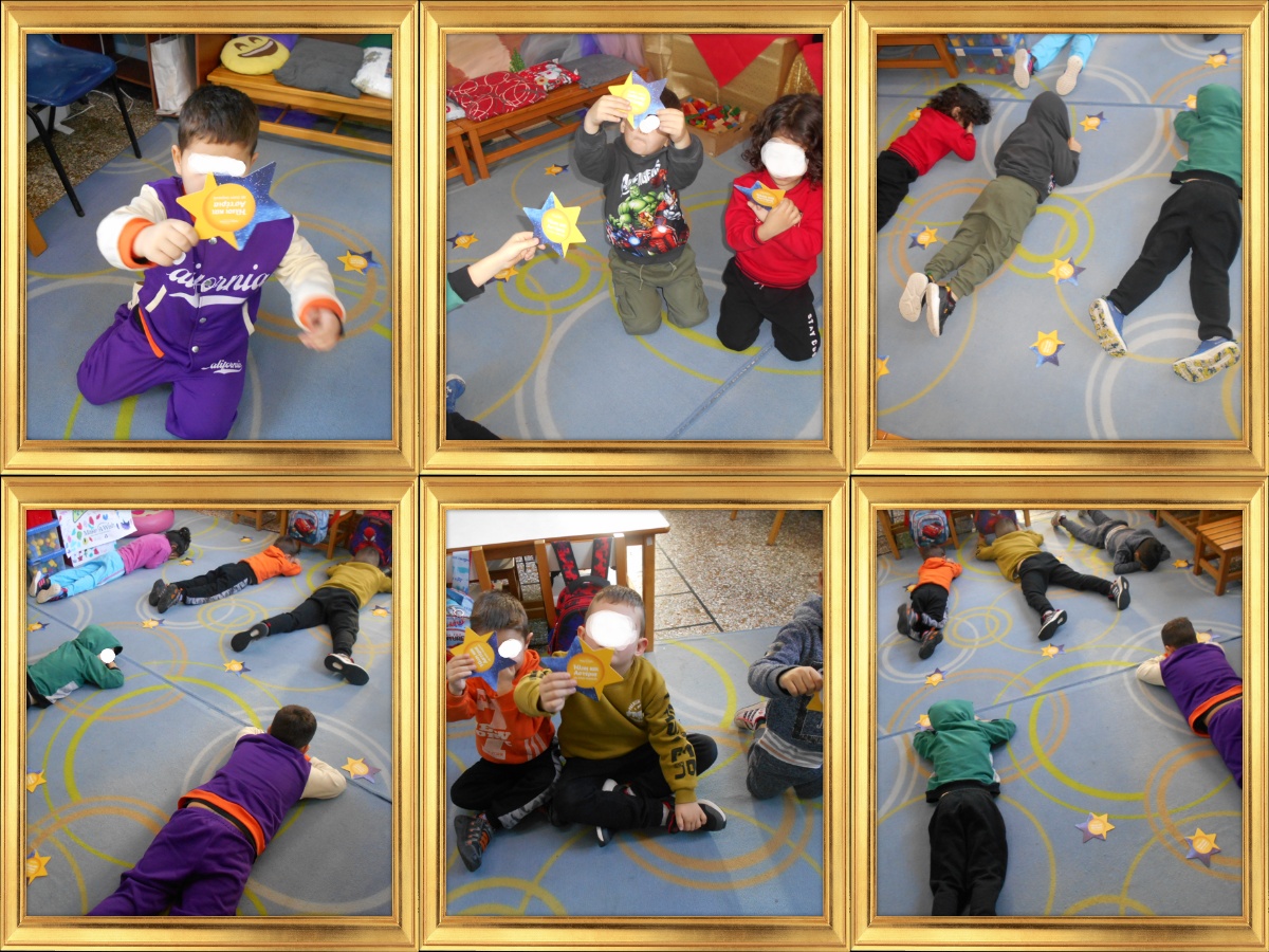 Τα παιδιά άνοιξαν τα μάτια και είδαν το αστέρι. Το πήραν και άρχισαν να περπατούν στις φτέρνες με μεγάλα, μικρά βήματα. Ανεβαίνουν στις μύτες των ποδιών και προσπαθούν να φτάσουμε και να πιάσουν κι άλλα αστέρια. Μεταφέρουν το αστέρι τους στην πλάτη, στο κεφάλι, το σηκώνουν ψηλά κ.λ.π.. Κάτι θέλει να μας πει…το πλησιάζουμε στο αυτί μας. Τι σας ψιθυρίζει; Τα παιδιά λένε την άποψή τους. Ποιος να έφερε άραγε τα αστεράκια, από πού ξεπήδησαν, από που να έπεσαν;