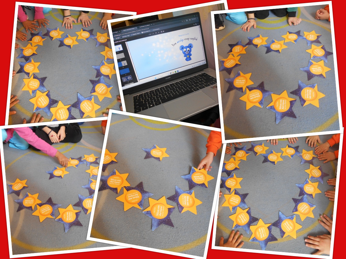 Παρουσιάζουμε το ηλεκτρονικό βιβλίο: «Ένα αστέρι στην καρδιά» και αναφέρουμε ότι από εδώ ξεπήδησαν. Από το βιβλίο. Διαβάσαμε το βιβλίο στα παιδιά και όταν τελειώσαμε ακολούθησε συζήτηση: Τι σας έκανε εντύπωση στη συμπεριφορά του ήρωα; Πώς θα τον χαρακτηρίζατε; Γιατί το αρκουδάκι ήθελε να γίνει δυνατό;κ.λ.π. Γράψαμε τη λέξη αρκουδάκι κάθετα και συμπληρώσαμε με λέξεις που βγήκαν μέσα από τη συζήτηση με τα παιδιά. Έτσι δημιουργήσαμε την ακροστιχίδα της καλοσύνης. Τέλος τα παιδιά χρησιμοποίησαν τα αστεράκια και σχημάτισαν μια καρδιά.