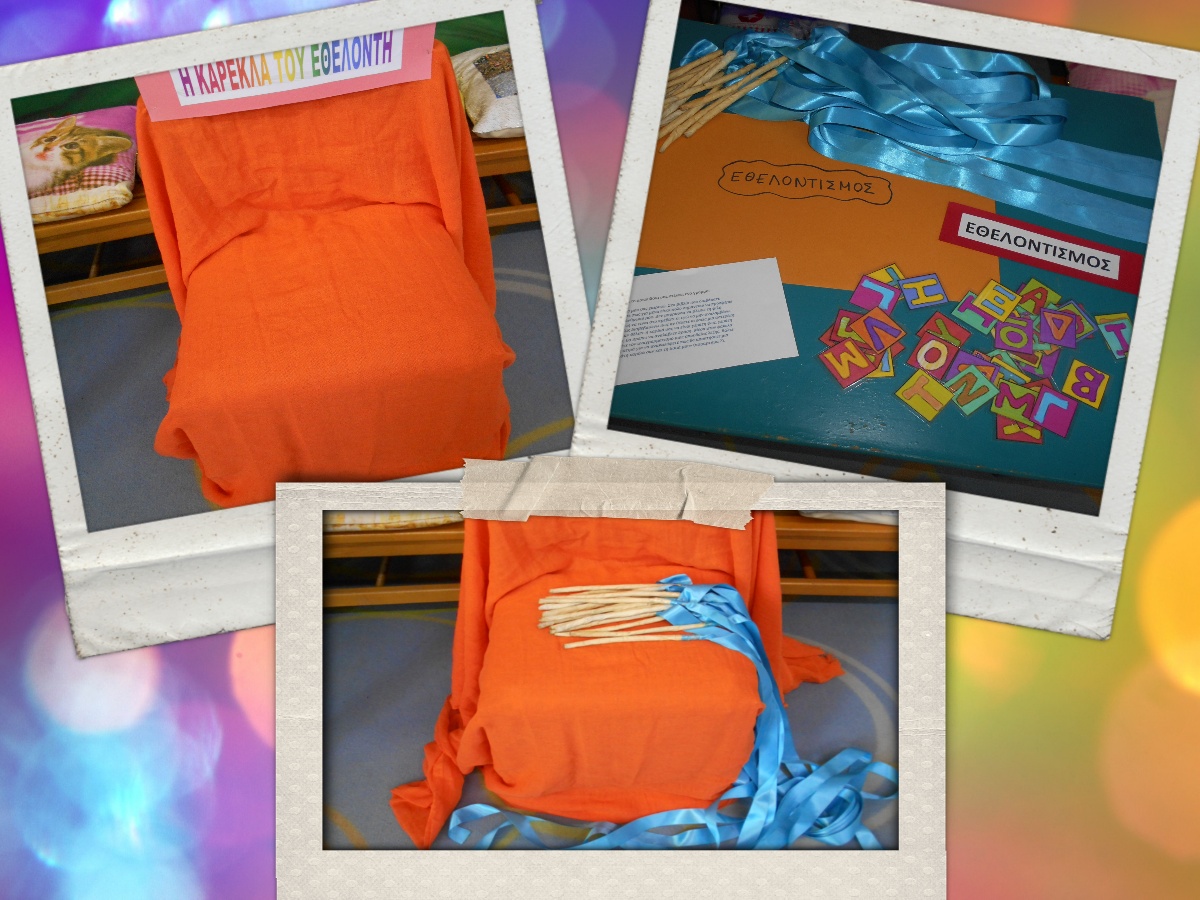 Παρουσιάσαμε μια καρέκλα ντυμένη με ύφασμα. Τα ρωτήσαμε αν έτυχε ποτέ να συμμετάσχουν σε κάποια εθελοντική δράση. Ένα ένα τα παιδιά κάθονται στην καρέκλα και με τη βοήθεια της Νηπιαγωγού μας λένε την εμπειρία τους και τα υπόλοιπα παιδιά τους κάνουν ερωτήσεις για αυτή τους την εμπειρία. Δεν επιμένουμε για παιδιά που δεν θέλουν.