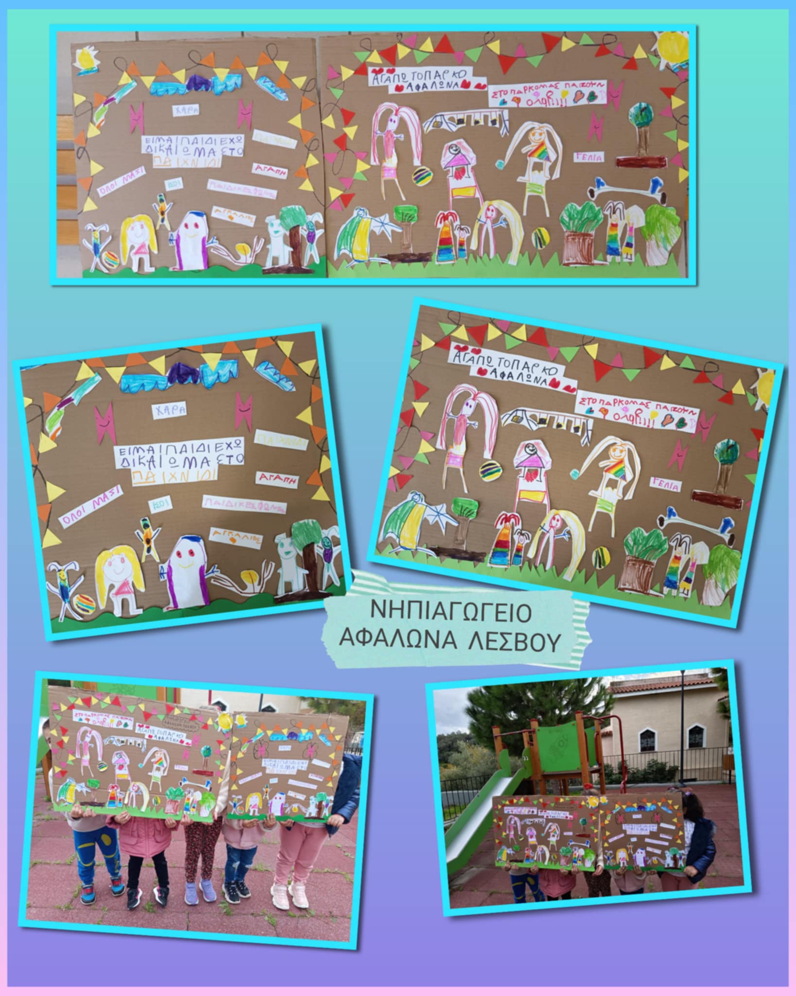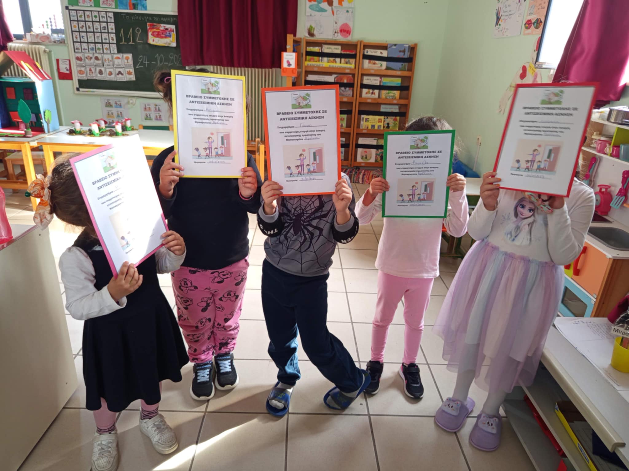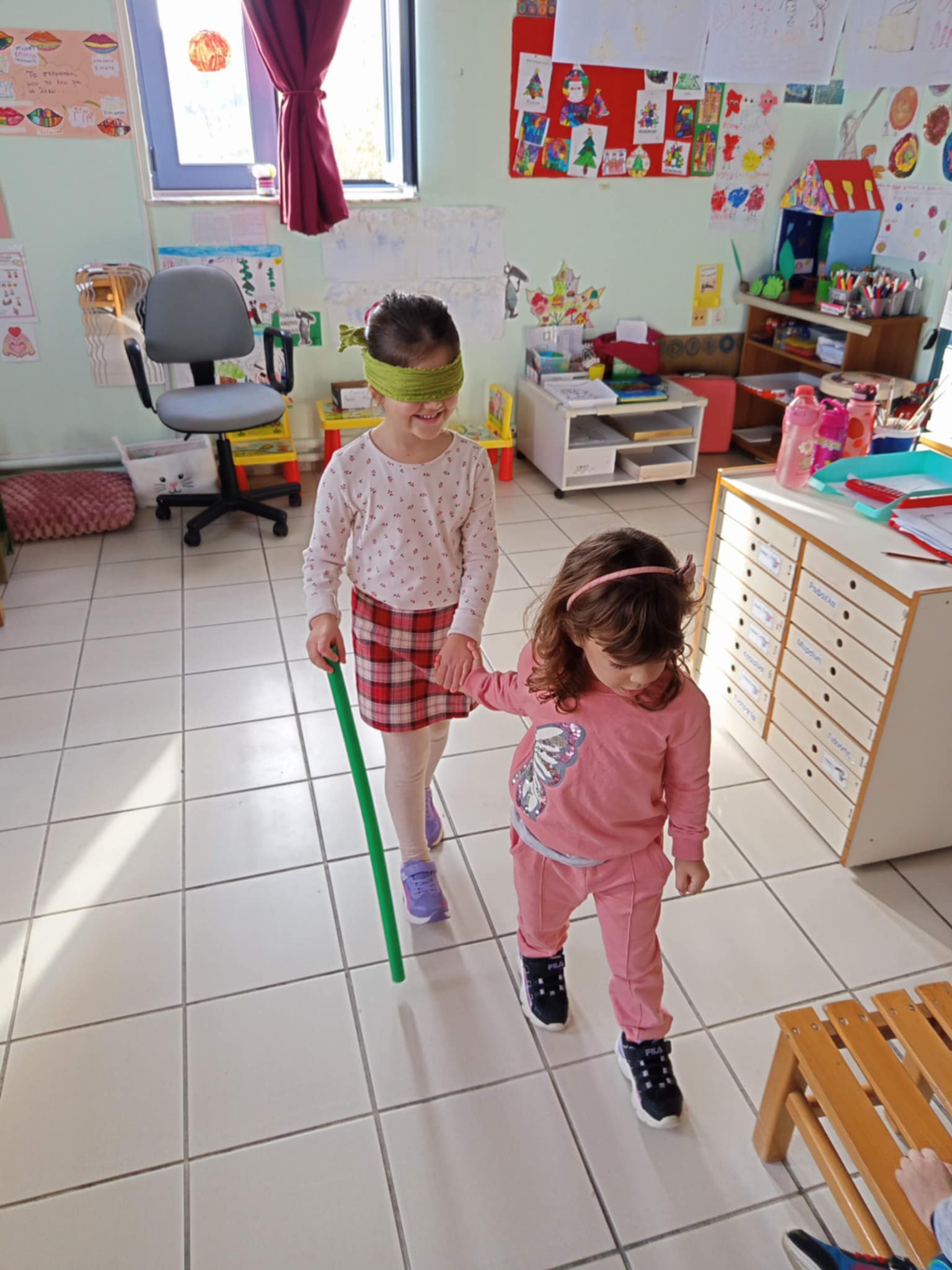 Στο Νηπιαγωγείο μας μιλήσαμε για τον σεβασμό στην διαφορετικότητα του κάθε ατόμου. Μέσα από πολλές δραστηριότητες μπήκαμε στο παπούτσι των ατόμων με αναπηρία και νιώσαμε τις ανάγκες και το δικαίωμα τους για ίσες ευκαιρίες σε όλους τους τομείς ζωής . Συζητήσαμε , μοιράστηκαμε εμπειρίες και απόψεις. Μπήκαμε στη θέση τους και μέσα από ποικίλες δραστηριότητες βιώσαμε τα προβλήματα και τη καθημερινότητα αυτών των ατομων. Για την κατανόηση δυσκολιών όρασης/ τυφλότητα, κάναμε διαδρομές με μπαστούνι με κλειστά μάτια, με την μυρωδιά μαντέψαμε διάφορα αντικείμενα αλλά και μόνο με την αφή και με κλειστά μάτια.