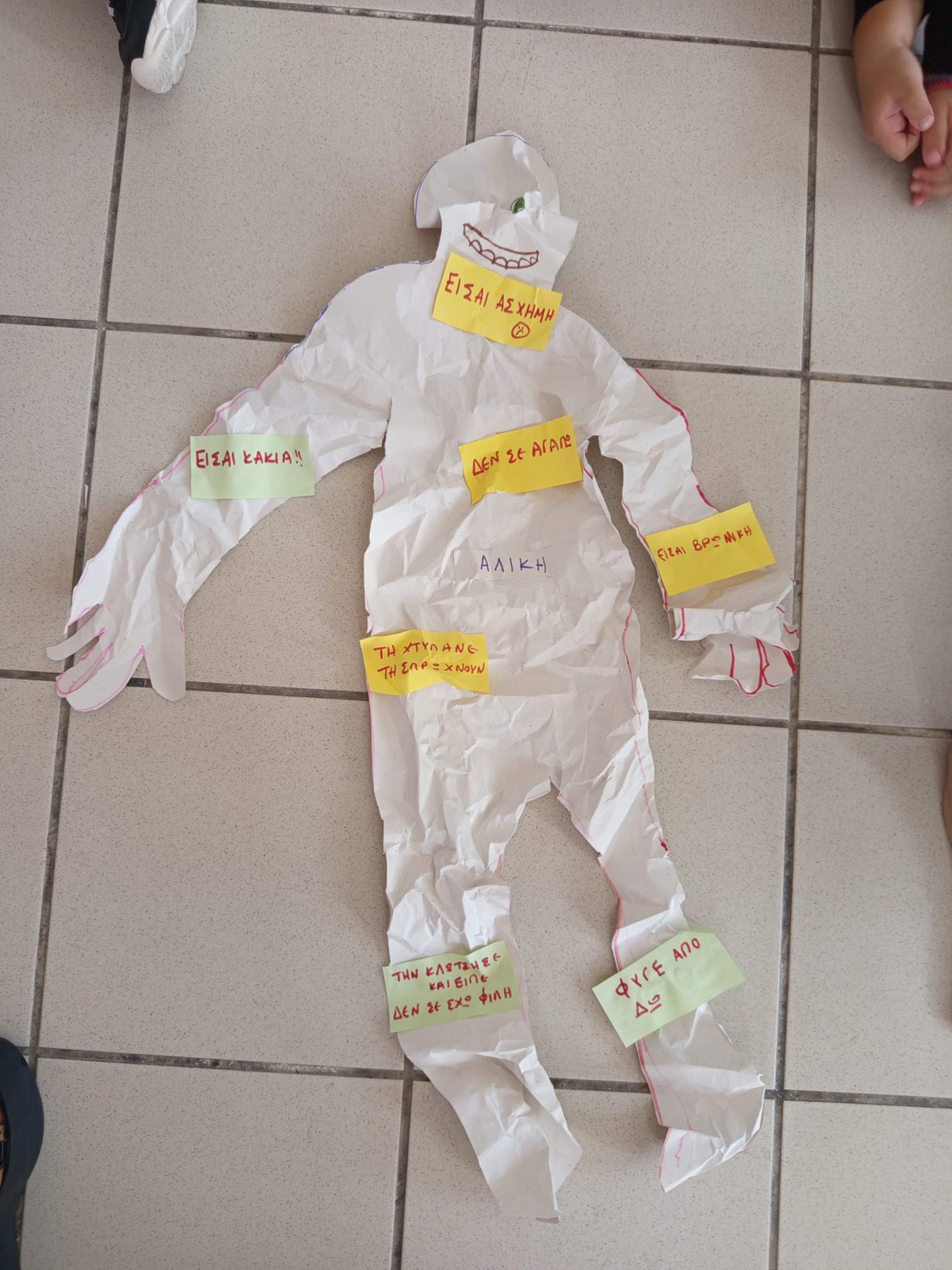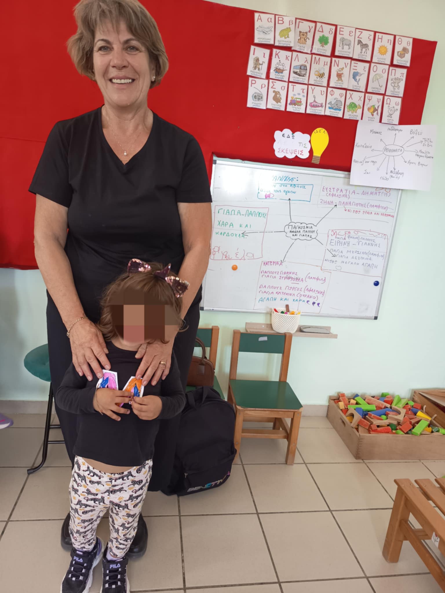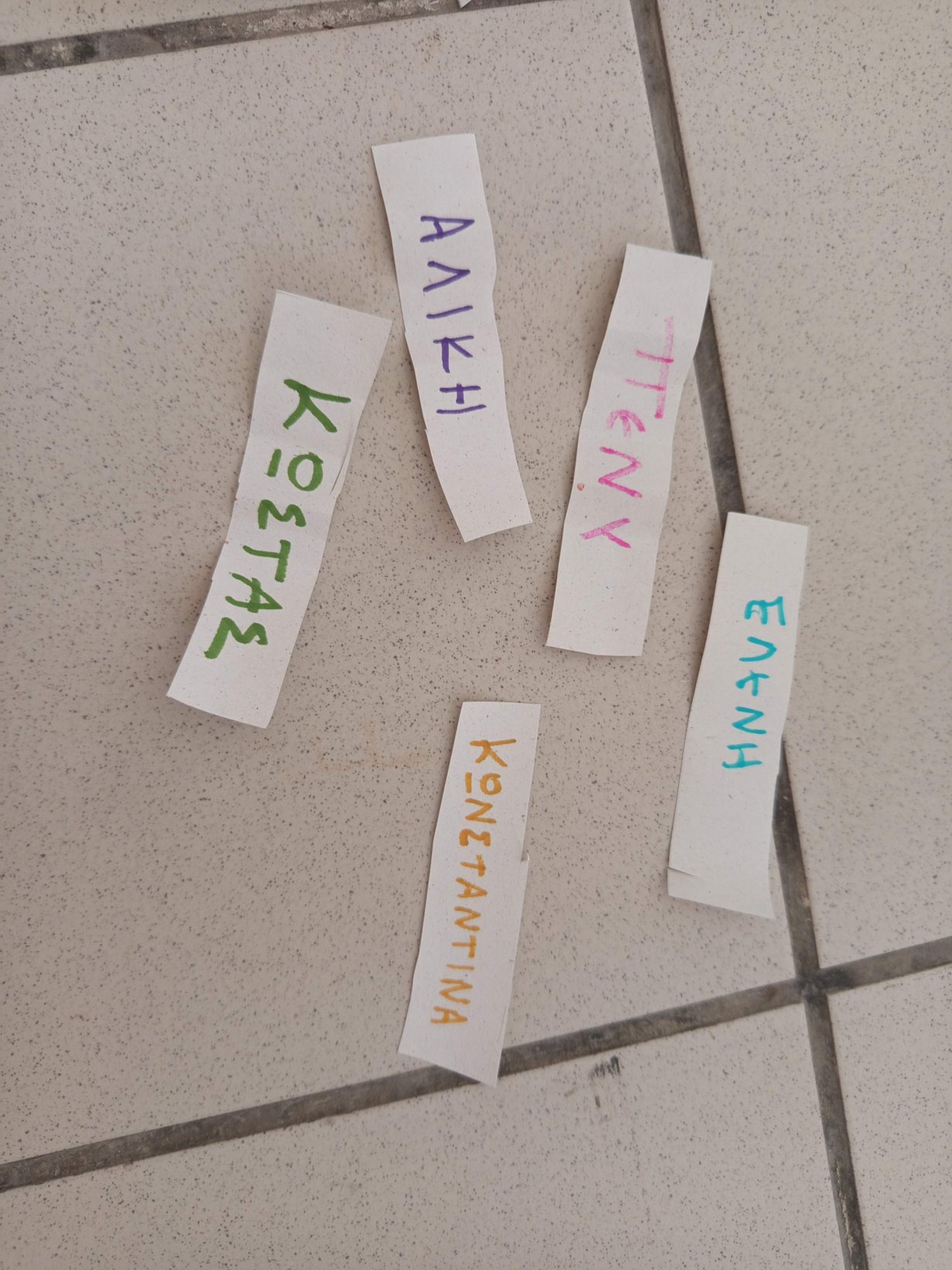 Στη συνέχεια παίξαμε το παιχνίδι “βρες το αρχικό σου γράμμα”. Τα παιδιά μαζί με τις κυρίες έκρυψαν το αρχικό γράμμα από το όνομα της κάθε γιαγιάς, σε διάφορα σημεία του σχολείου και εκείνες μια-μια το έψαξαν με τις οδηγίες των παιδιών “ζεστό-κρύο”.
