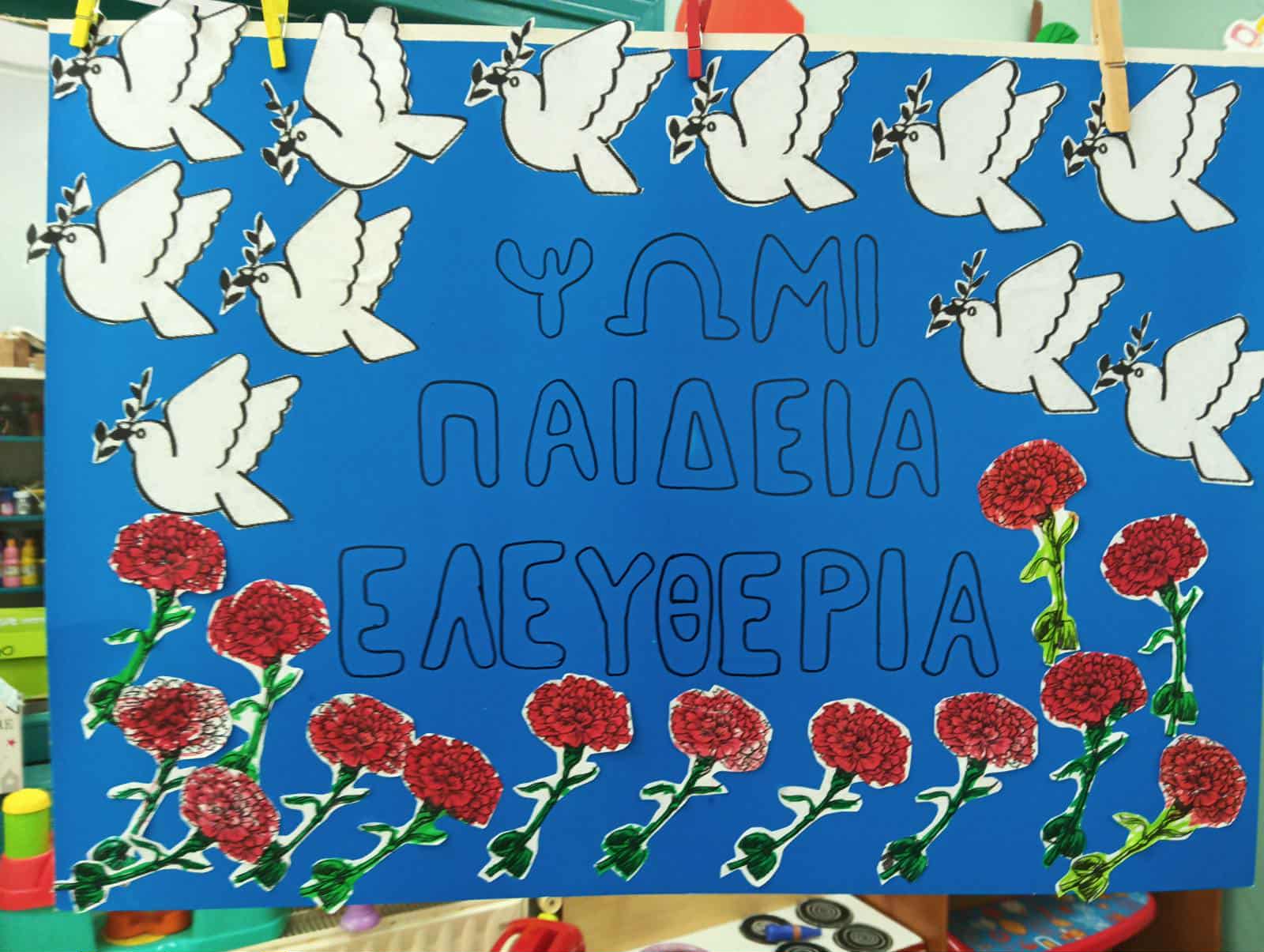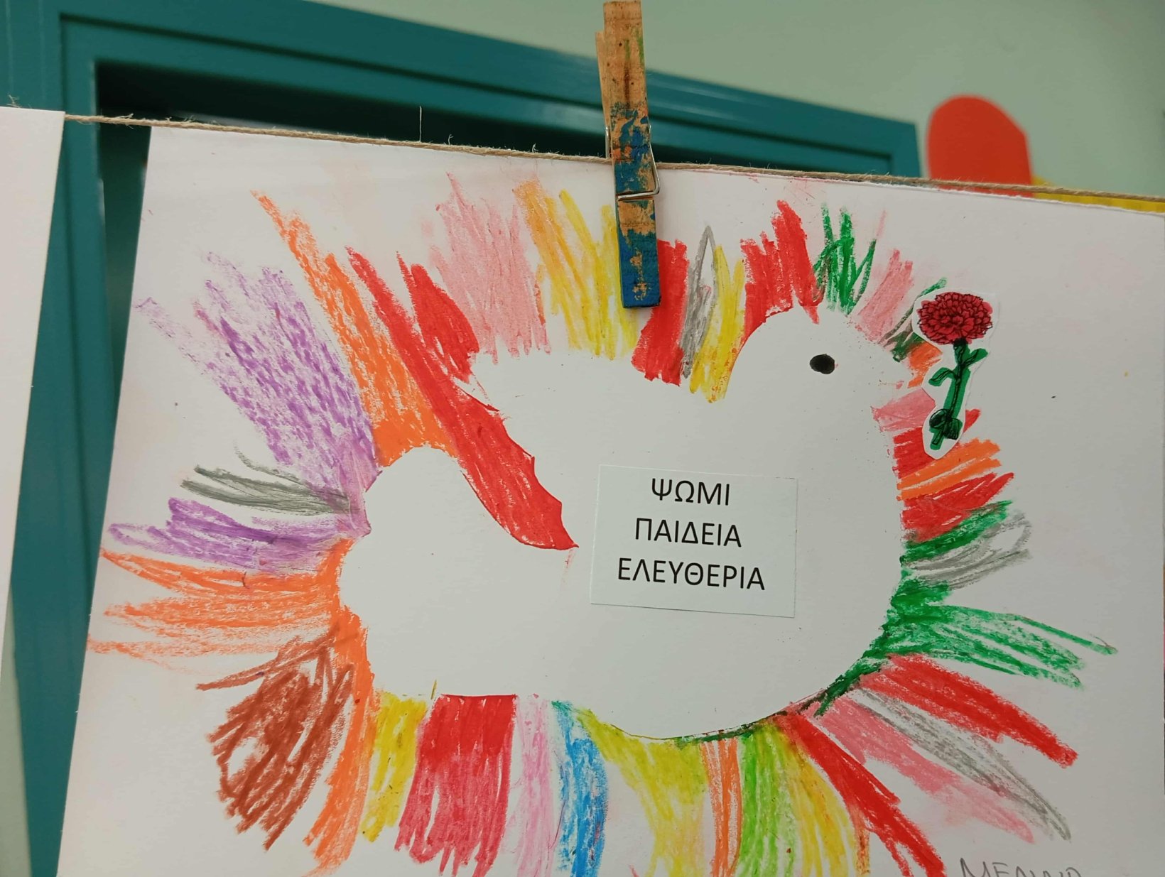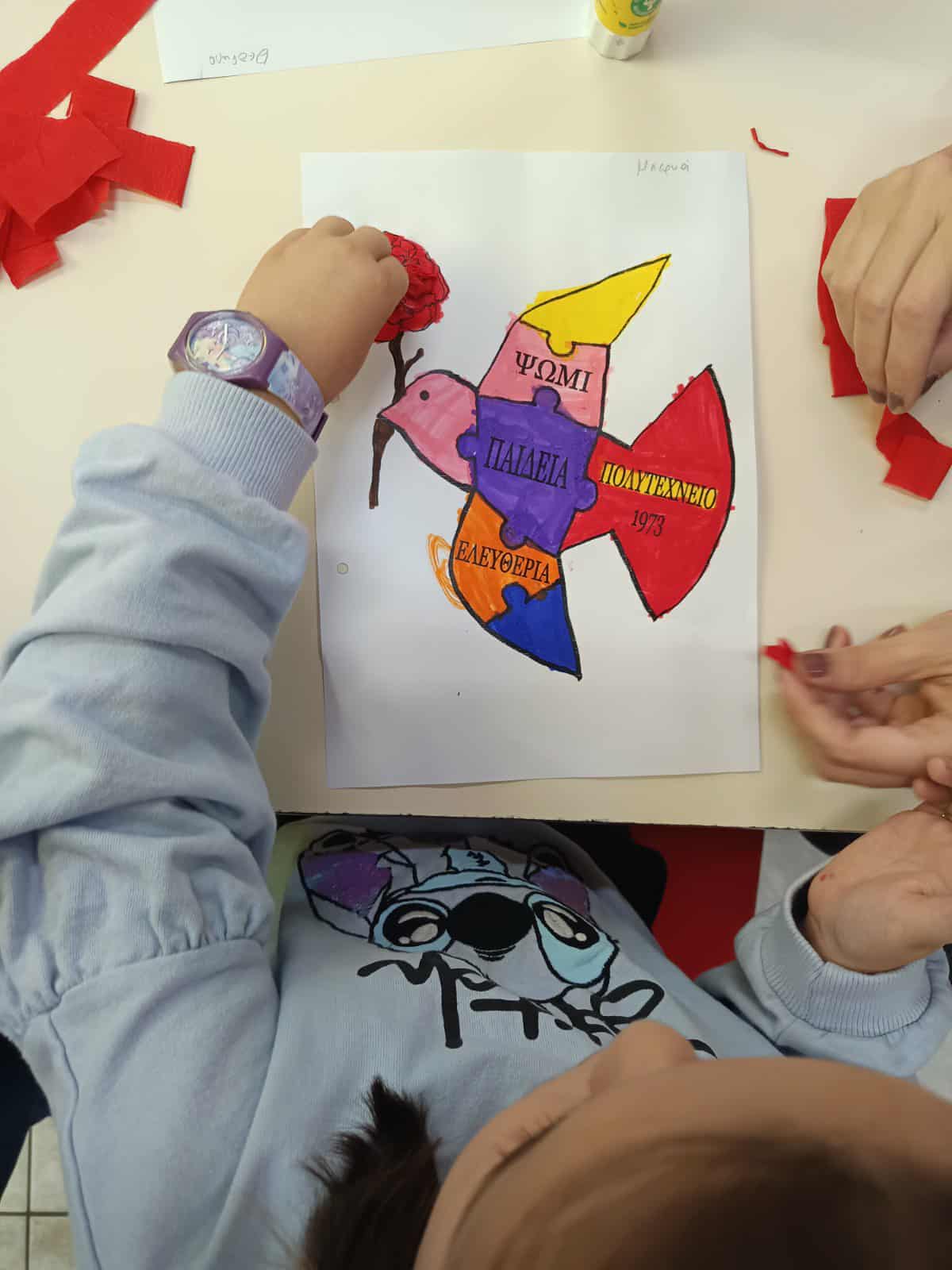 Με αφορμή την επέτειο του πολυτεχνείου τα παιδιά είδαν φωτογραφικό υλικό και βίντεο των γεγονότων του πολυτεχνείου, ακούσαμε τραγούδια και φτιάξαμε ατομικές και ομαδικές εργασίες.