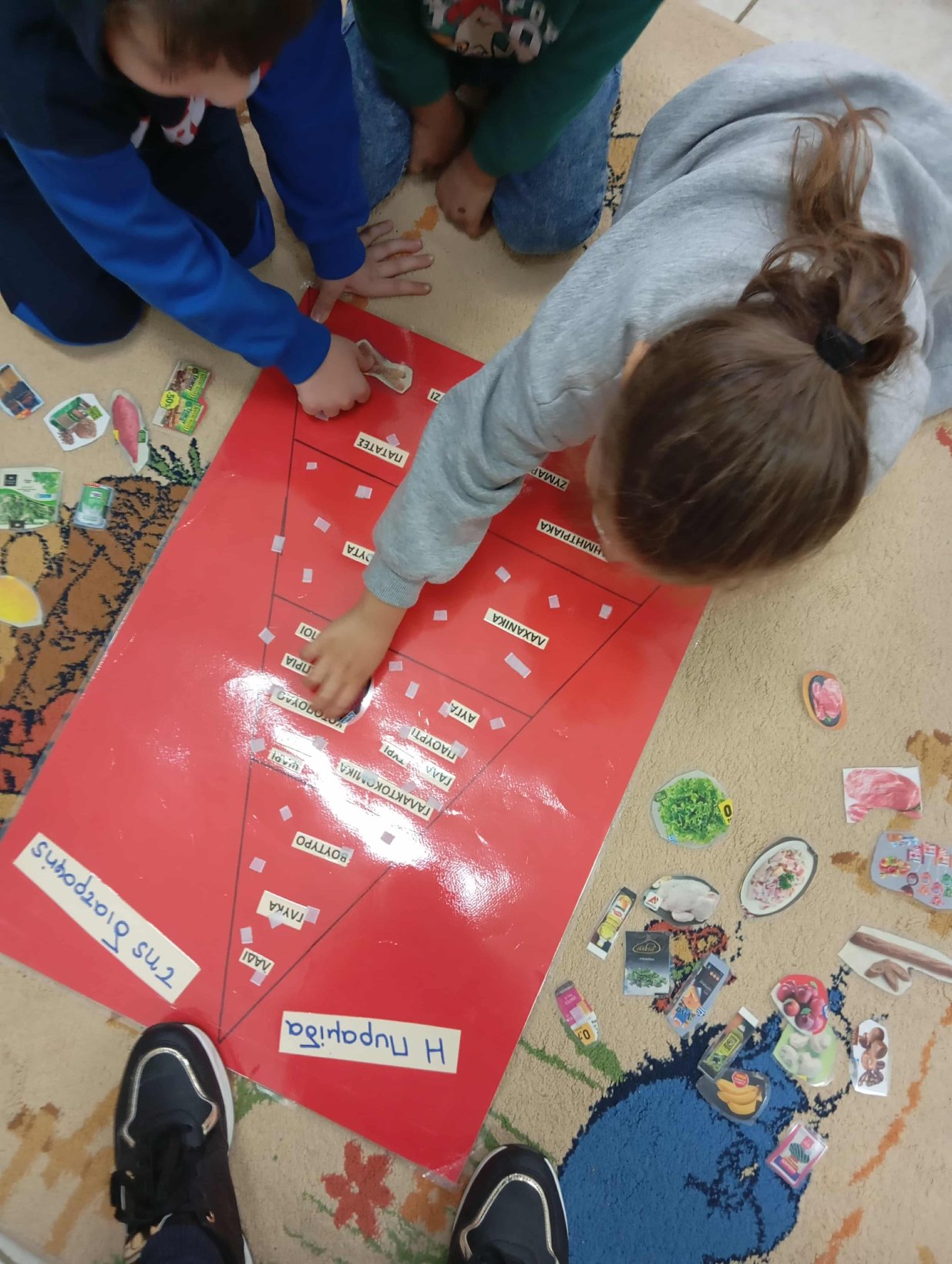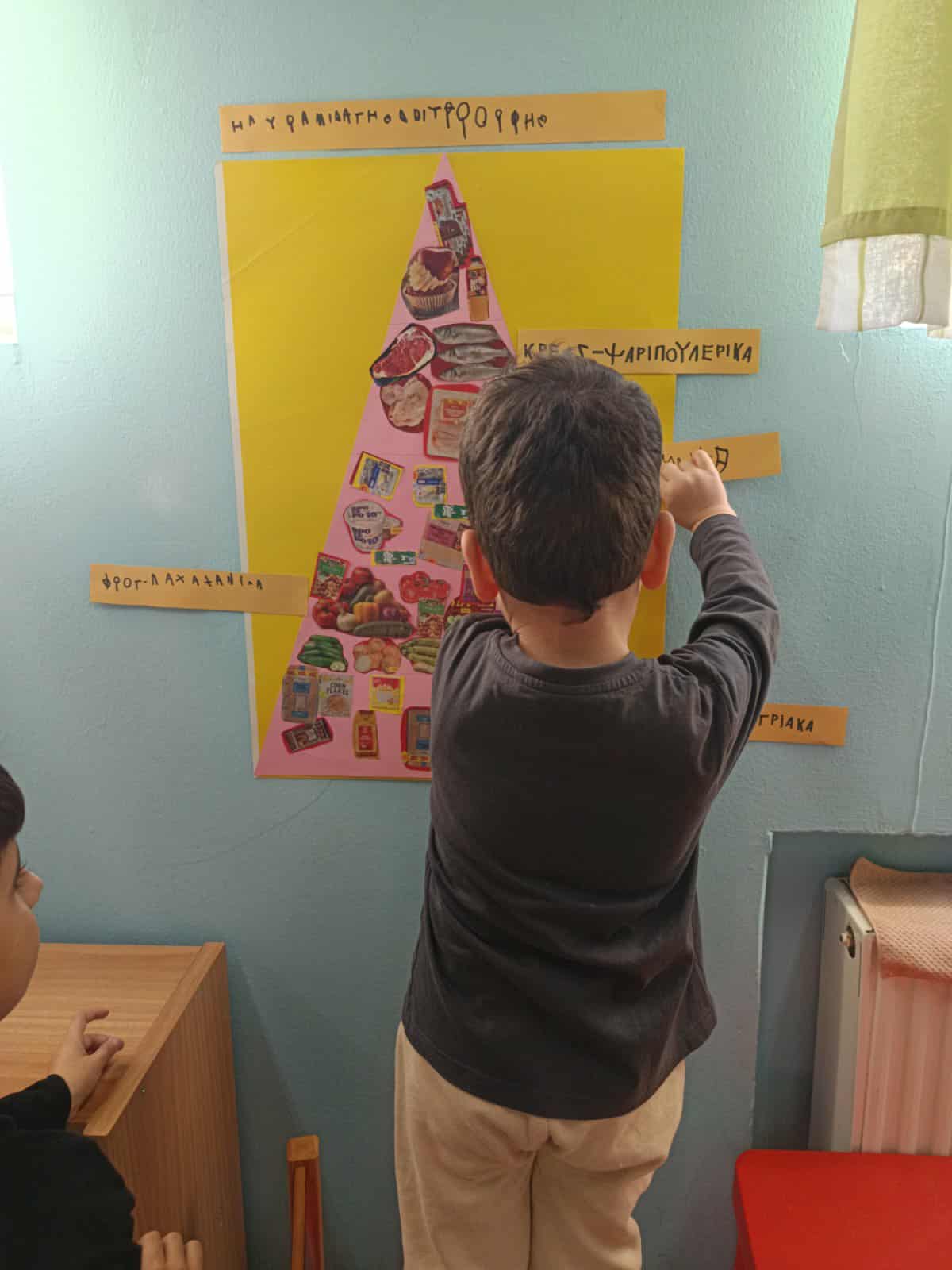 Τα παιδιά γνωρίσαν την πυραμίδα της υγιεινής διατροφής, γνώρισαν τις κατηγορίες των τροφών, τα φρούτα και τα λαχανικά της εποχής αινίγματά χορούς και πίνακες με αυτά, ενημερωθήκαν για το ρόλο της γυμναστικής και του νερού στον οργανισμό μας και τέλος με την επίσκεψη της διατροφολόγου στο σχολείο μας μάθανε και παίξαμε πως πρέπει να τρεφόμαστε σωστά.