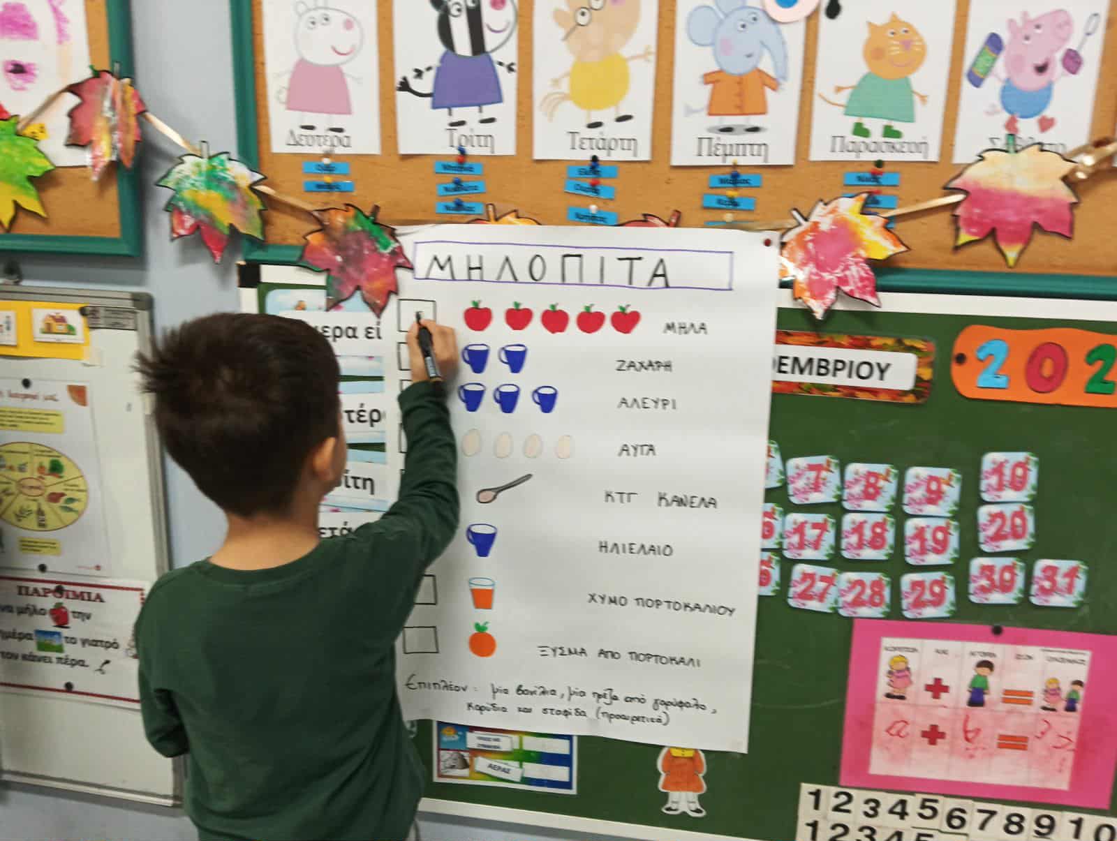 στην ίδια δράση Ενεργού Πολίτη, για την διατροφή και της υγιεινές συνήθειες φτιάξαμε μηλόπιτα, κάτι που μας αρέσει πολύ χωρίς να είναι πολύ επικίνδυνο για την υγεία μας. Εξασκήσαμε τα μαθηματικά μας, μάθαμε να μετράμε τα υλικά που χρειαζόμαστε, τα γράψαμε και στην συνέχεια εκτελέσαμε την συνταγή.