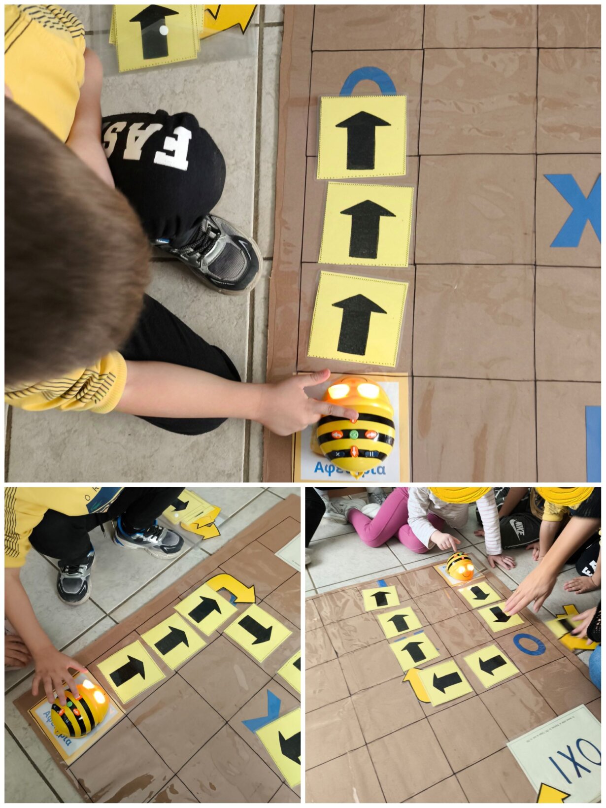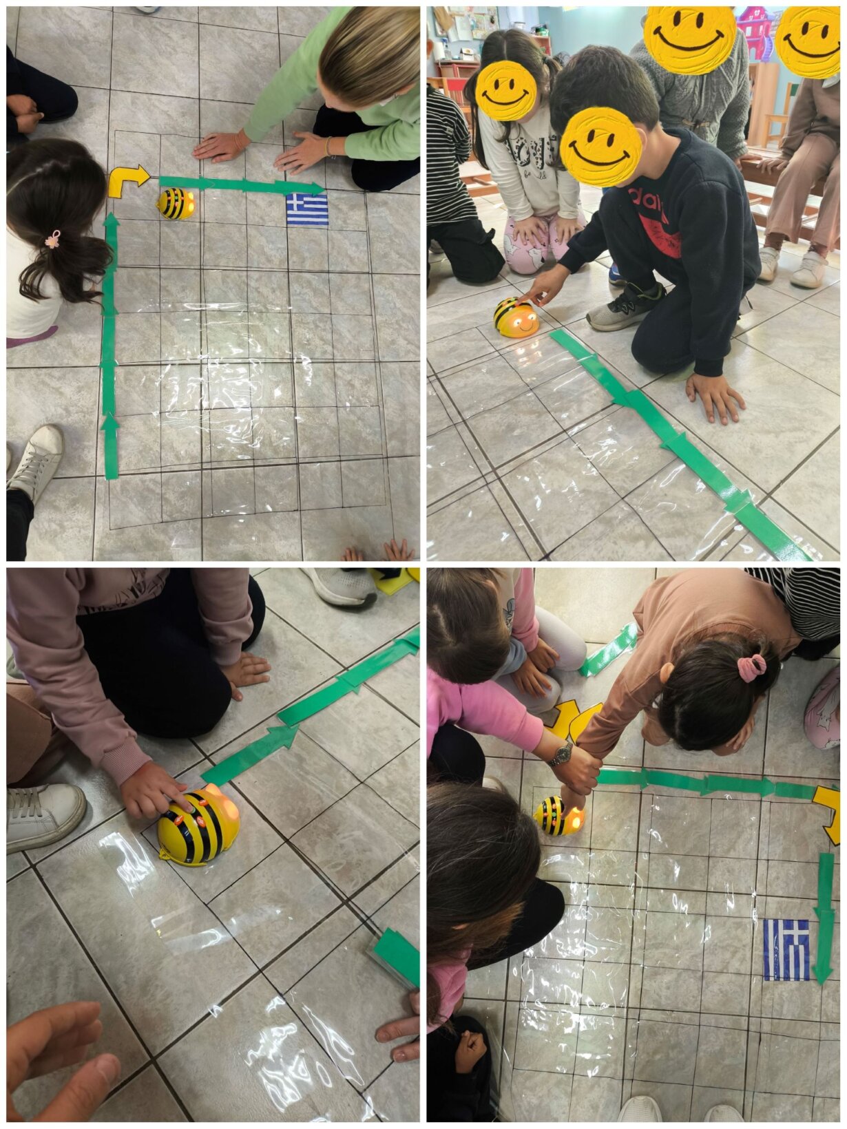 1.Στα πλαίσια της θεματικής ενότητας για την 28η Οκτωβρίου, τα παιδιά κατά τη διάρκεια της ολομέλειας ήρθαν σε μια πρώτη επαφή με το Beebot. Ξεκινώντας από μια συγκεκριμένη αφετηρία, δημιούργησαν δικές τους διαδρομές προκειμένου να φτάσουν στην ελληνική σημαία. Συνεργάστηκαν, διατύπωσαν υποθέσεις, εξασκήθηκαν σε έννοιες χώρου και κατευθύνσεων και ήρθαν σε επαφή με βασικές αρχές προγραμματισμού.