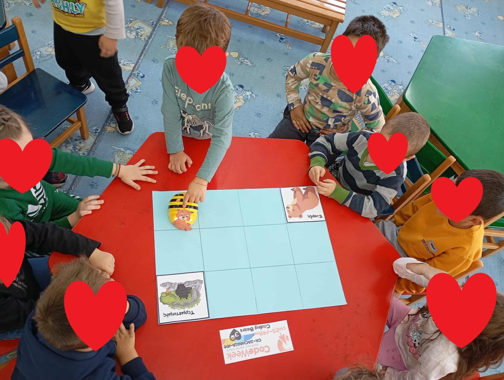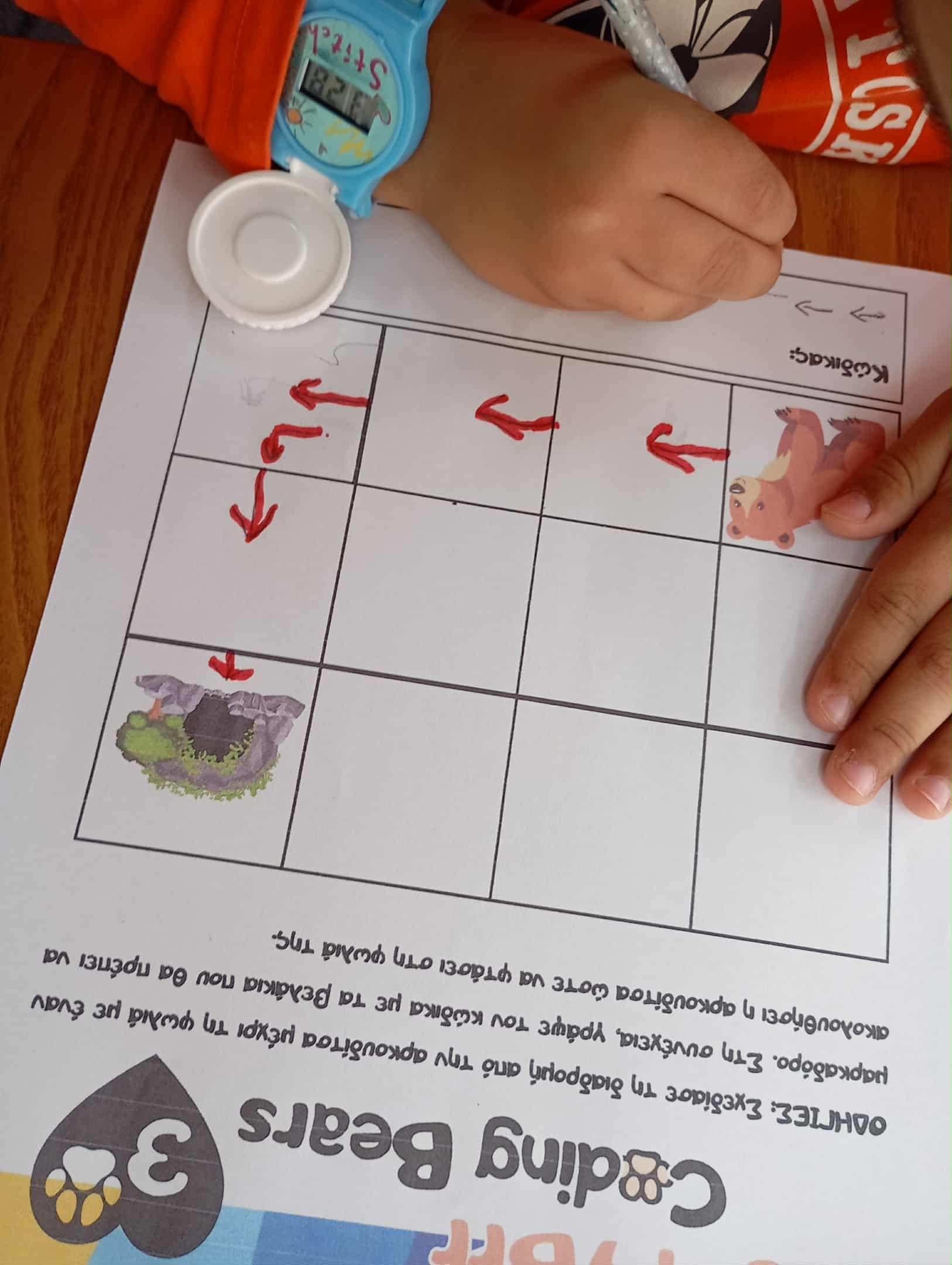 Το ένα τετράγωνο είναι η αφετηρία, όπου ξεκινά η αρκουδίτσα και ένα άλλο η φωλιά. Τα παιδιά πρέπει να τοποθετήσουν στο πάτωμα τα βελάκια κατεύθυνσης και να “προγραμματίσουν” το παιδί αρκουδάκι να φτάσει στη φωλιά του.