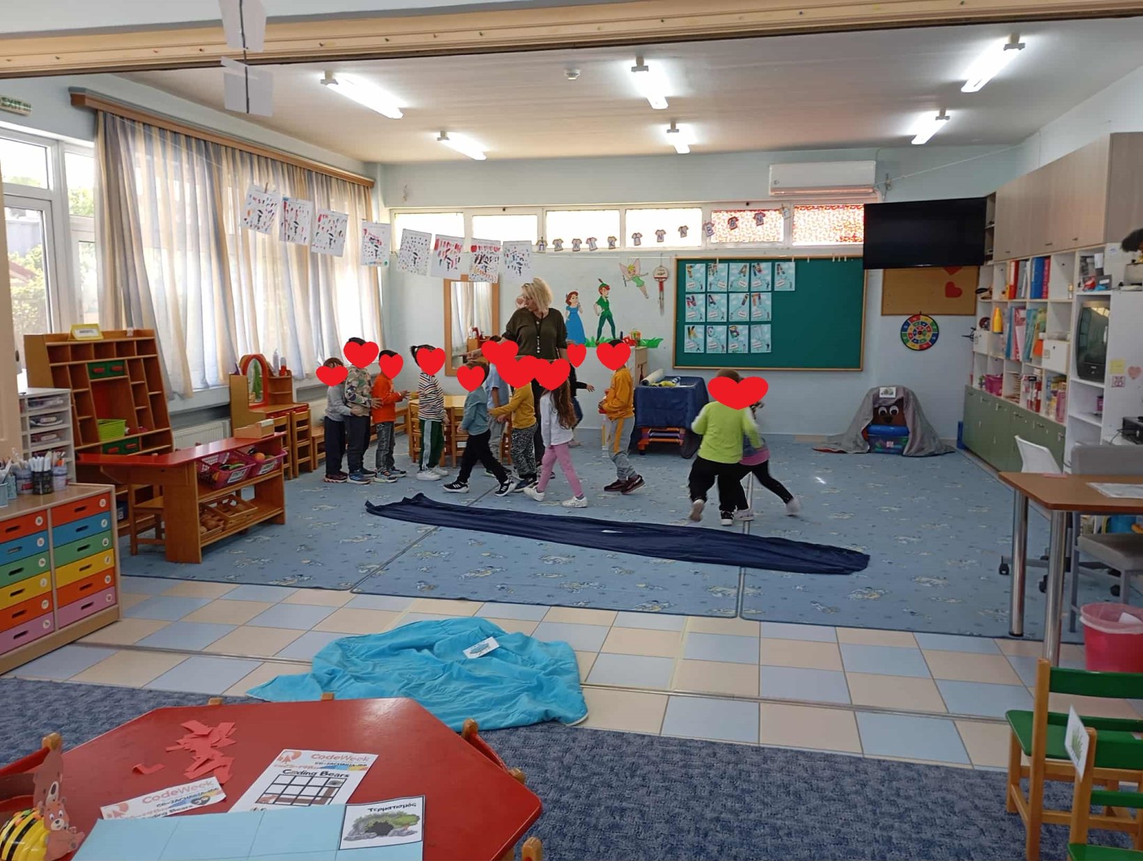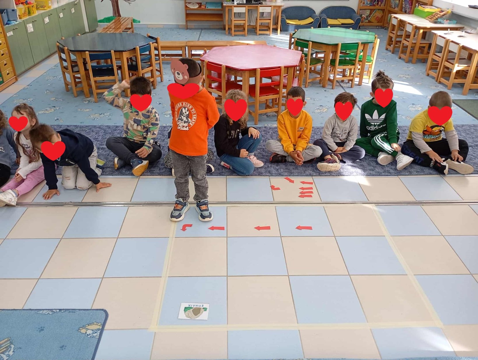 Στο δάπεδο έχουμε ετοιμάσει ένα τετραγωνισμένο πλαίσιο 12 τετραγώνων ( πλακάκια). Το σενάριο λέει ότι η αρκουδίτσα έχασε τη φωλιά της και πρέπει να τη βοηθήσουμε να τη βρει.