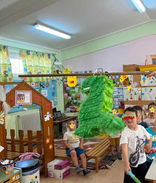 και προσπαθήσαμε ο καθένας μας να σπάσει την πινιάτα δεινόσαυρο που μας έφερε….