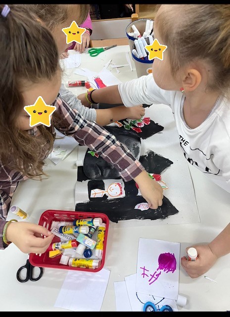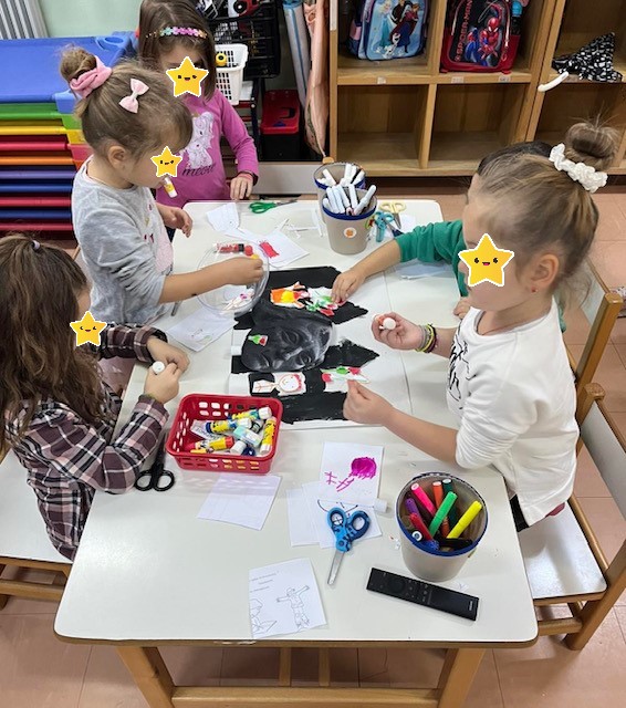 Στη συνέχεια τα παιδιά χωρίστηκαν σε δύο ομάδες . Η μία ανέλαβε την εικαστική απόδοση και οπτικοποίηση του παραπάνω τραγουδιού με την τεχνική του ψηφιδωτού…