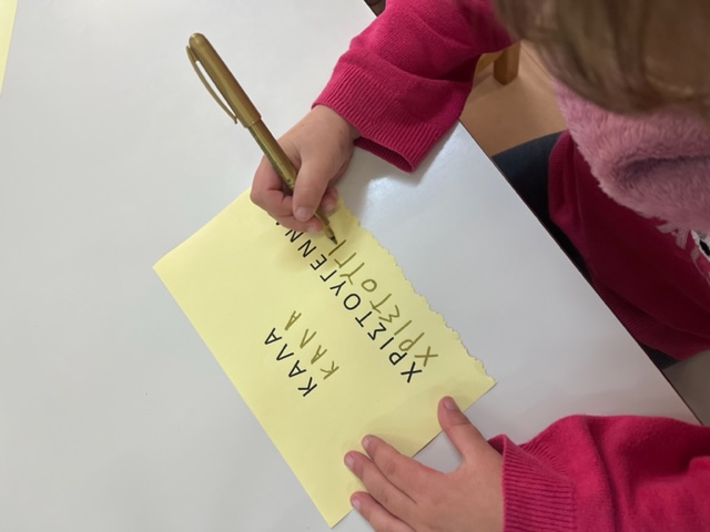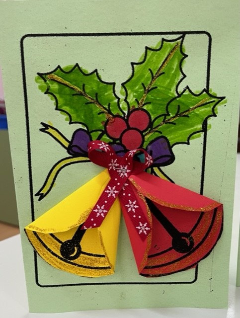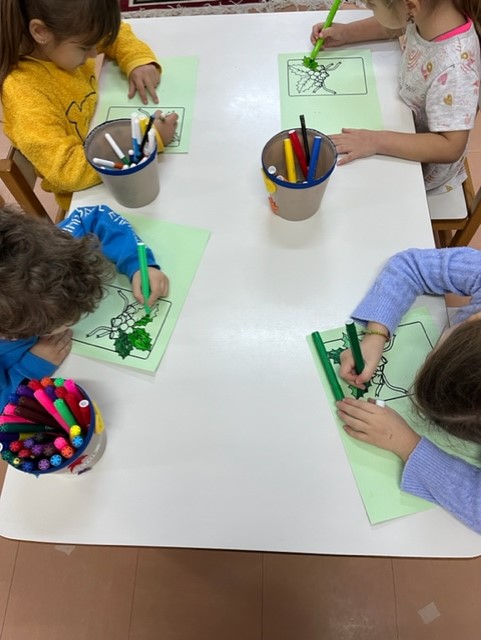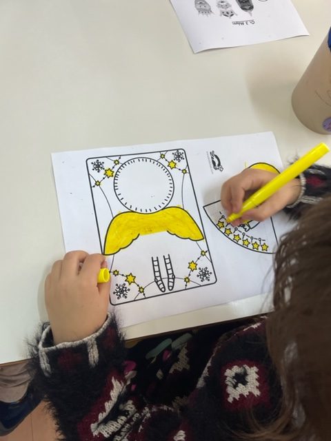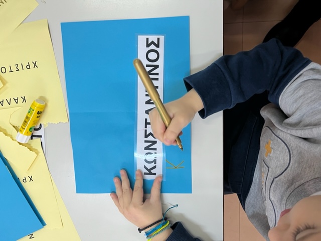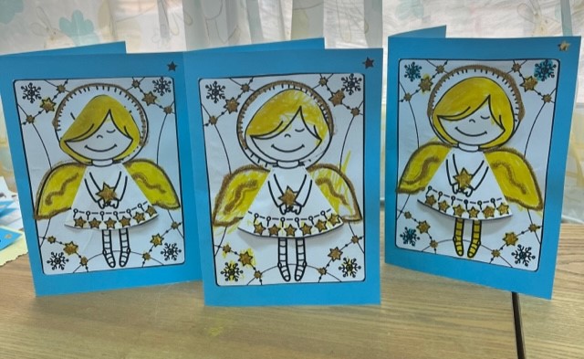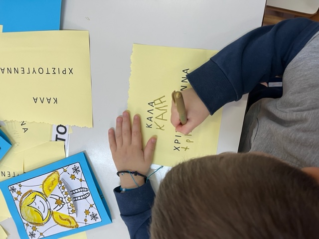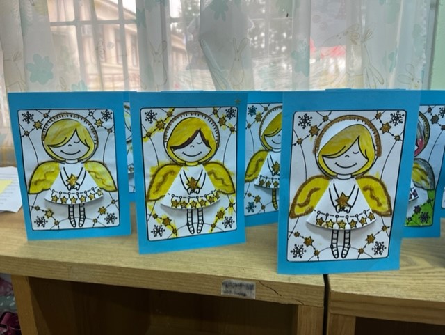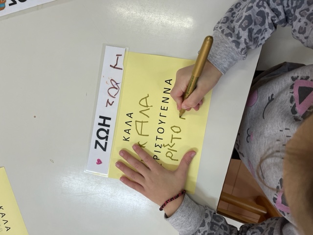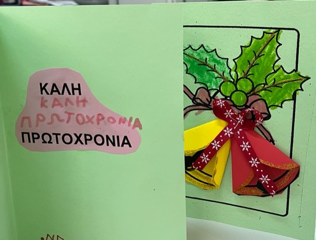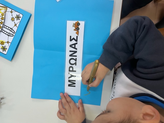Βάφουμε με μαρκαδόρο το πρότυπο αγγέλου που αντλήσαμε από το διαδίκτυο, κόβουμε το φόρεμα του αγγέλου , γράφουμε το εσωτερικό της κάρτας αφού πρώτα προβληματιστήκαμε για το ποια ευχή θα μπορούσε να γραφεί στο εσωτερικό της και να εναρμονιστεί με το περιεχόμενο της γιορτής στην οποία απευθύνεται …