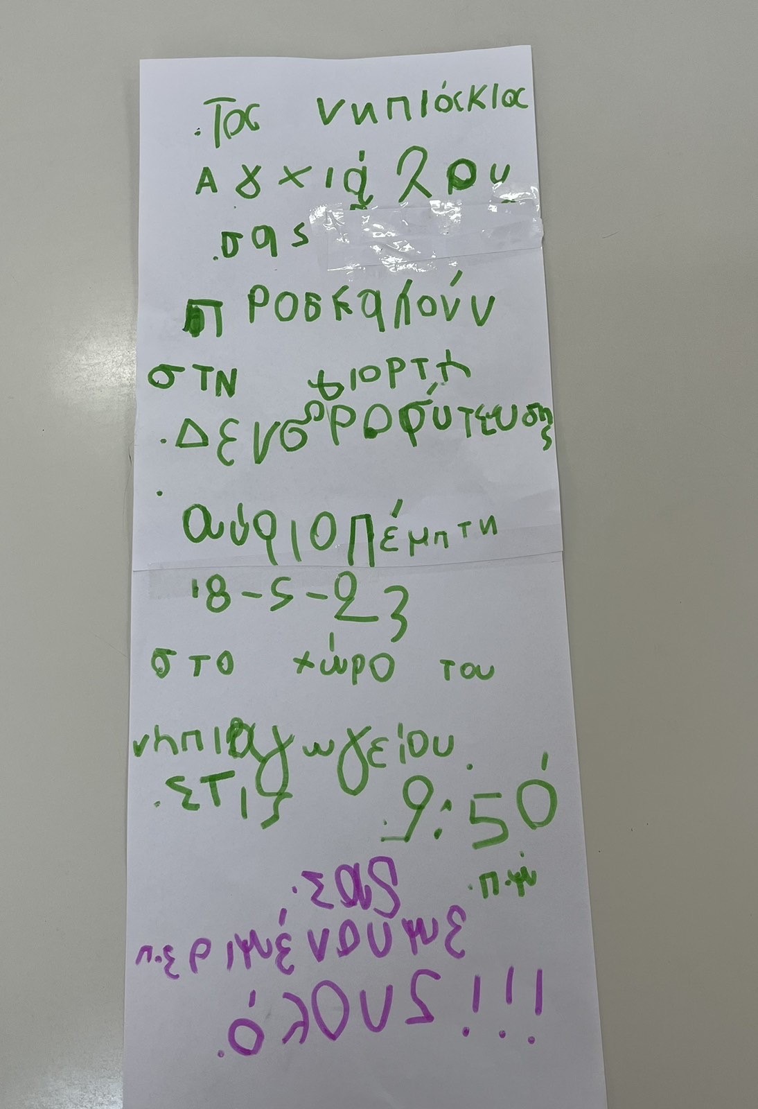 Το νηπιαγωγείο μας συμμετέχει στην εκπαιδευτική δράση” Φυτεύω και Υιοθετώ ένα δέντρο , δίνω ανάσα στη γη!” Οι μαθητές/τριες γράφουν συνεργατική πρόσκληση….